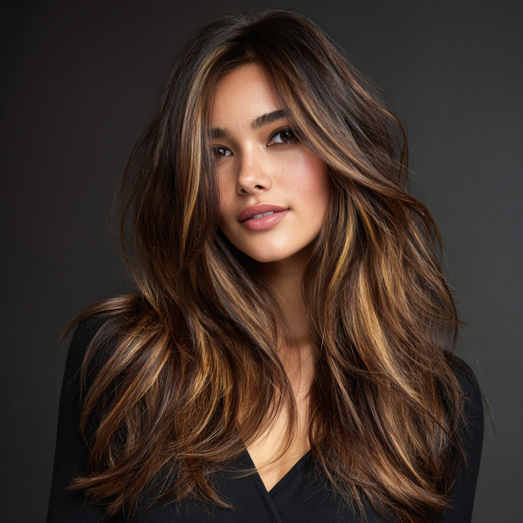 Warm caramel tones painted over dark brown strands create a sweet, glowing contrast. The color melts beautifully from roots to ends, giving your hair instant shine. It’s subtle yet eye-catching, perfect for anyone wanting a gentle upgrade. This look brings out your skin’s warmth and adds dimension with every flip.