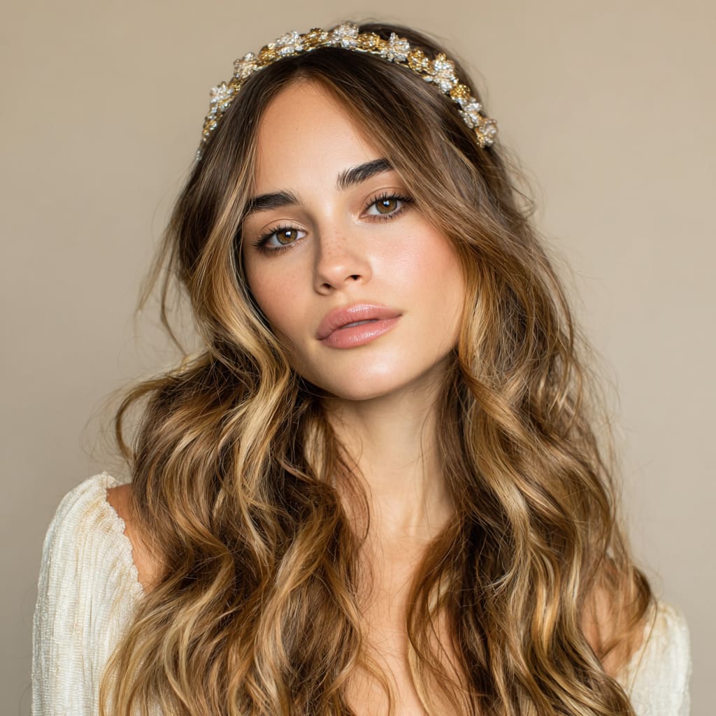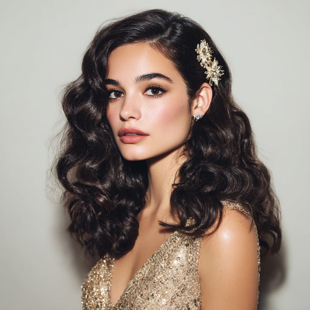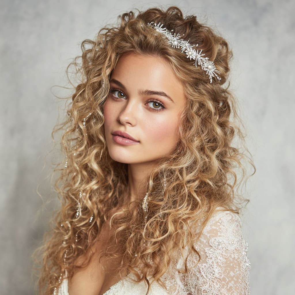 Loose curls topped with a delicate snowflake headband look straight out of a winter fairytale. The icy sparkle pairs beautifully with soft makeup. It’s a dreamy style for holiday dinners and Christmas photos.
