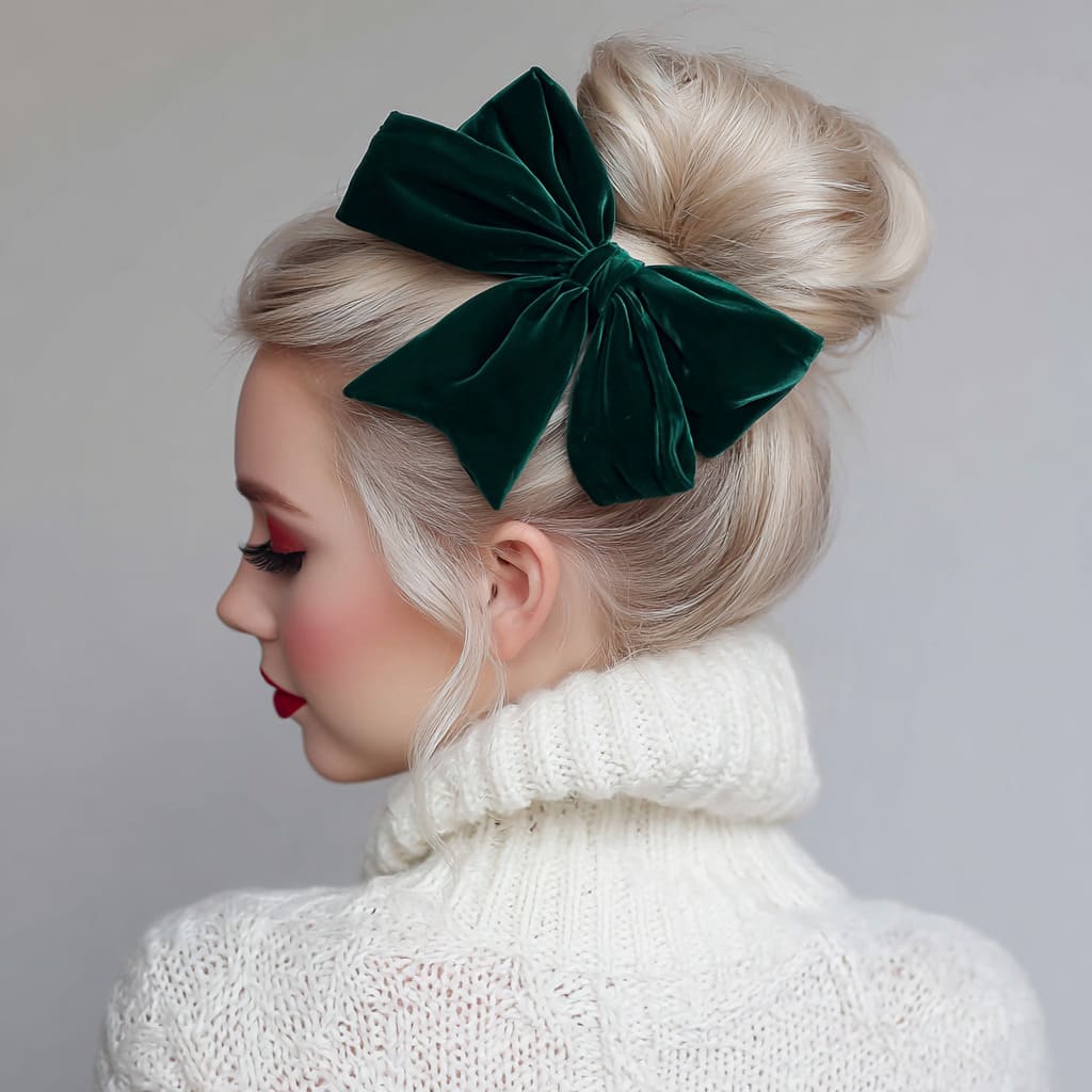 Tie a big bow on top of your bun to make it look like a wrapped gift. It’s bold, eye-catching, and so much fun. A perfect style if you love playful Christmas fashion.