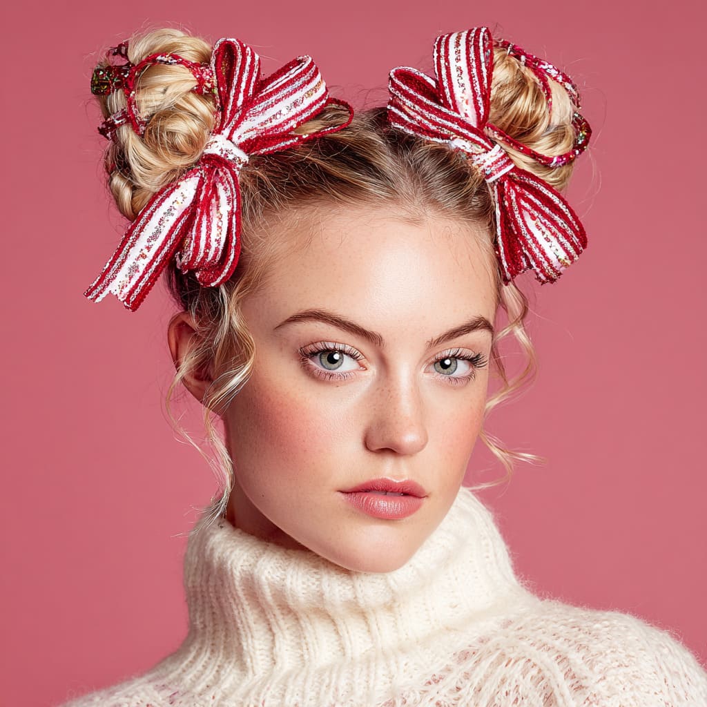 Two space buns wrapped in red and white ribbons feel bold and fun. Add glitter to your roots for extra holiday cheer. It’s youthful, trendy, and perfect for dancing.