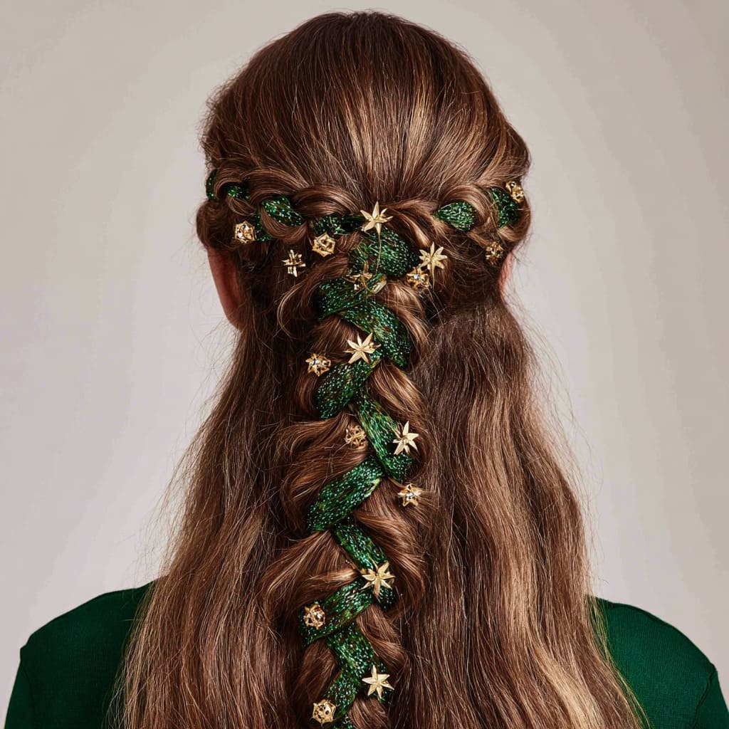 Weave your hair into a braid and pin in small ornaments or star clips. The shape naturally resembles a tree, especially with green ribbon laced through. Add a star pin at the bottom for the final festive touch.