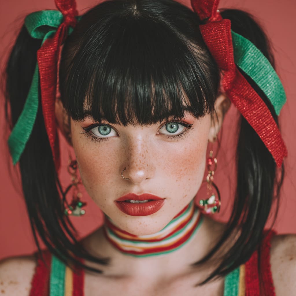 Loose curls wrapped with temporary red and white streaks give a playful candy cane effect. It’s sweet, festive, and instantly makes your look stand out. Add a shiny bow at the back to tie the whole vibe together.