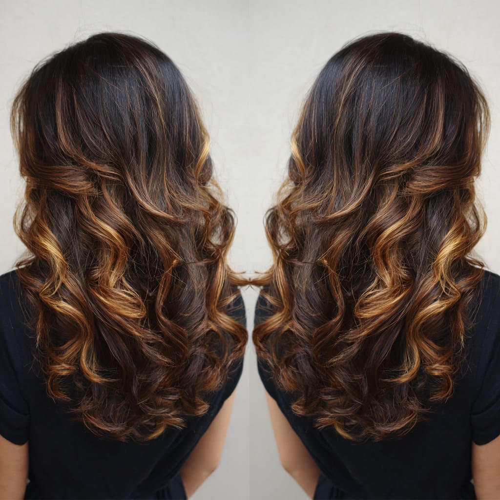 Golden blonde highlights woven into dark hair mimic the warm glow of a fire. Style in loose curls for maximum effect. It’s subtle but cozy and festive.