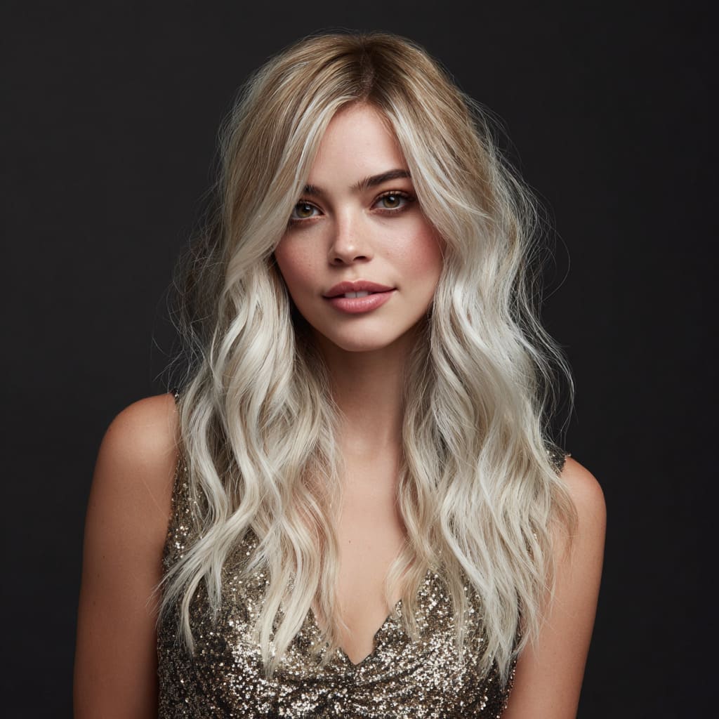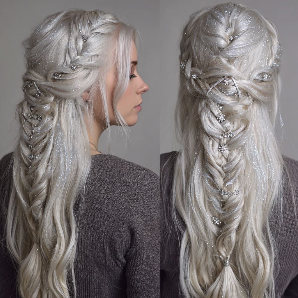Blonde or brunette hair with frosted silver ends gives a wintry vibe. Style in waves to highlight the shimmer. It’s subtle but festive.