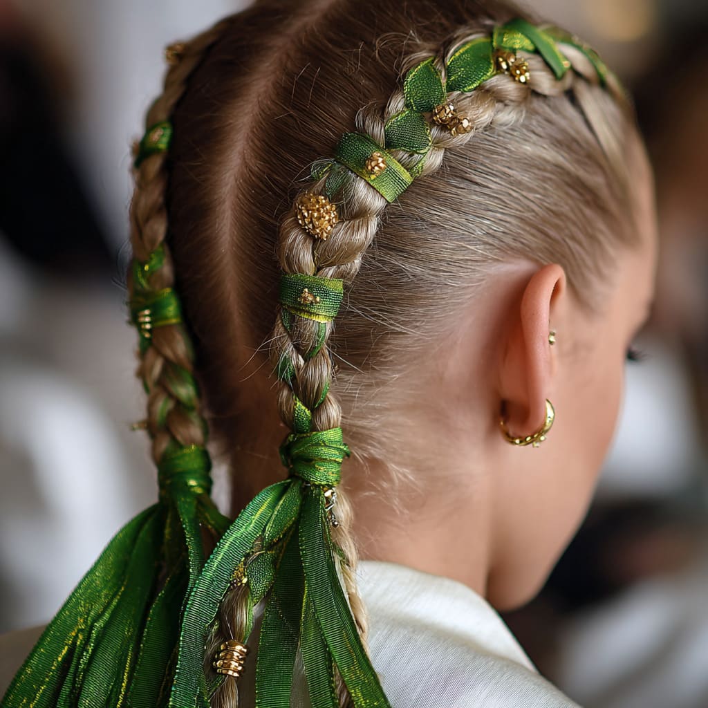 Weave green ribbon through braids so they resemble garlands. Add tiny gold pins to finish the look. It’s festive, fun, and creative.