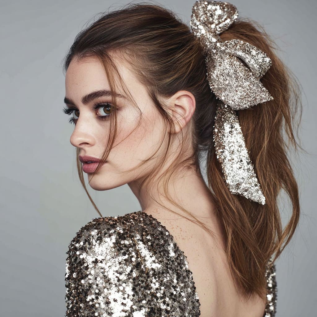 Tie your ponytail with a sparkly bow that looks like it belongs on a Christmas present. It’s playful and quick but has instant holiday charm. Pair with a sequined dress for extra glam.