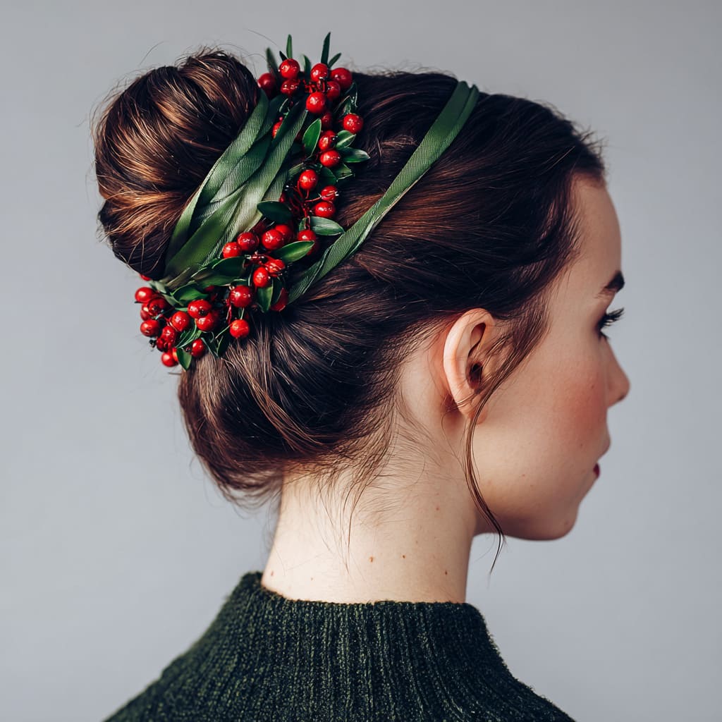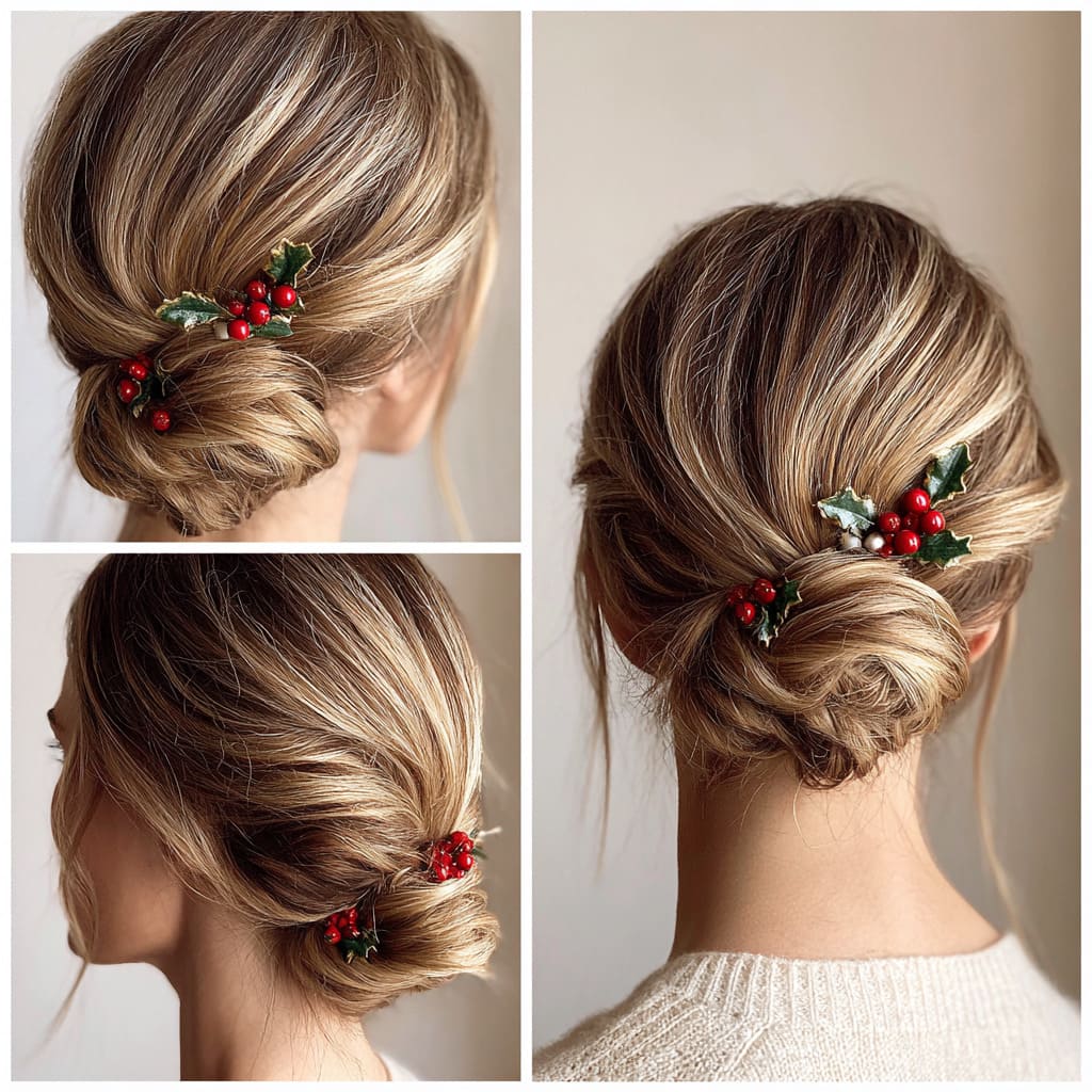 Twist your hair into a sleek bun and decorate it with tiny holly berry clips. The pops of red and green feel whimsical yet classy. It’s the kind of hairstyle that screams Christmas without being over the top.