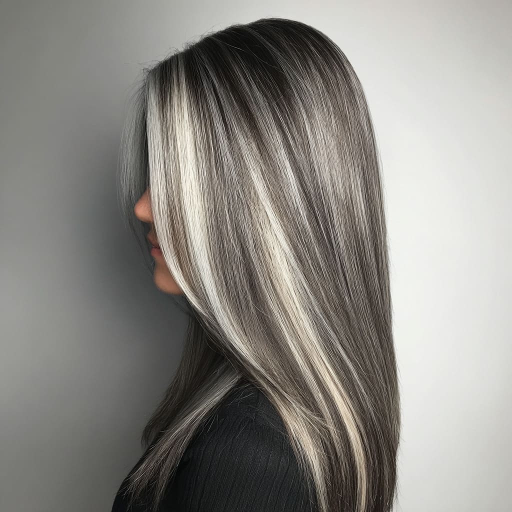 Straighten your hair to glossy perfection and add icy silver highlights. It’s sleek, modern, and chic. This hairstyle feels like walking through a frosty winter night.