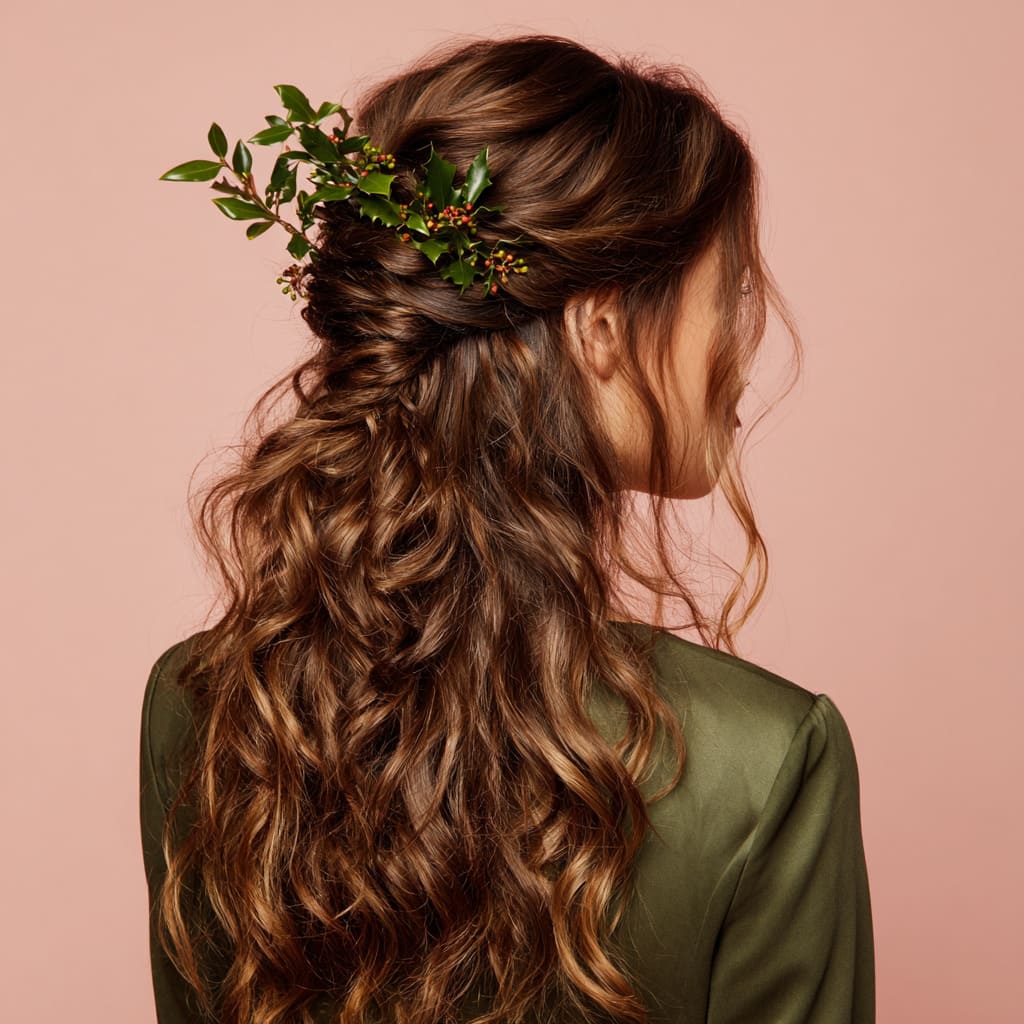 Pin a mistletoe accessory at the back of a half-up hairstyle for a cheeky twist. It’s playful and guaranteed to be a conversation starter. Pair with soft curls for a romantic vibe.