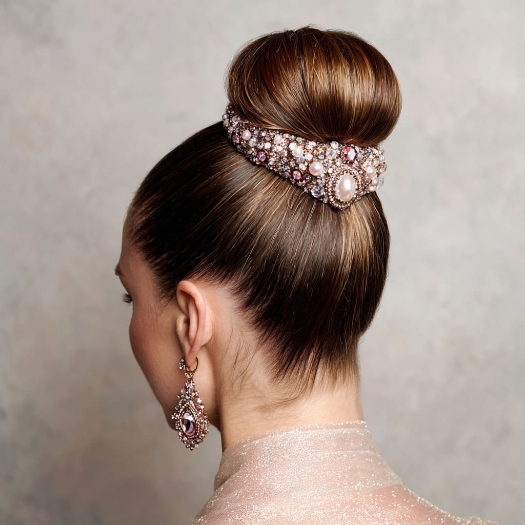 A ballerina-style bun decorated with glitter and gems channels Nutcracker ballet vibes. It’s elegant, graceful, and totally Christmassy. A lovely choice for more formal events.