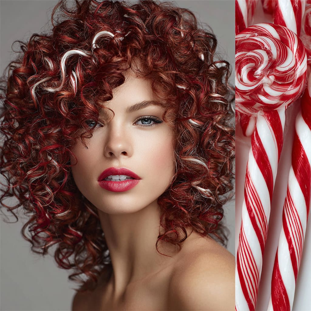 Add red streaks to your curls for a peppermint swirl look. It’s bold, fun, and perfect for themed parties. Pair with a candy cane prop for extra flair.