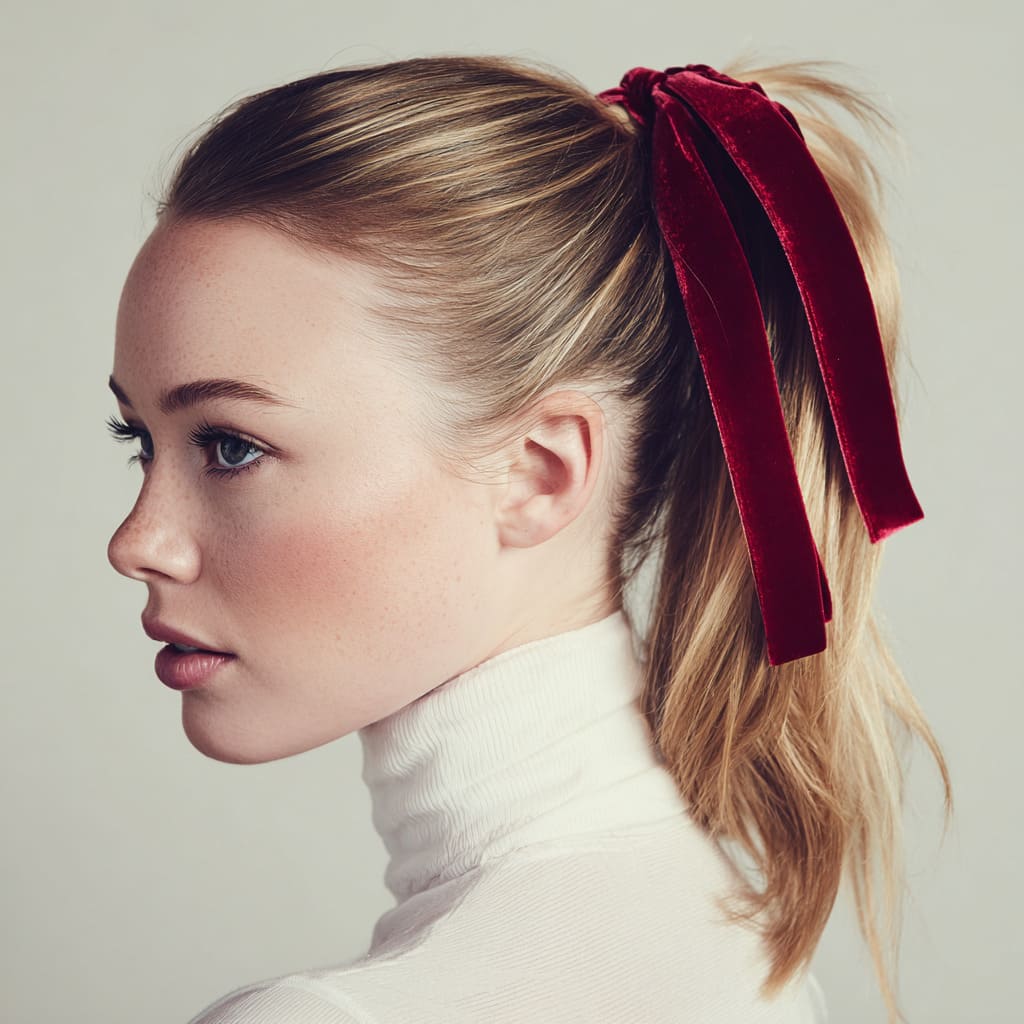 A high ponytail tied with a wide red velvet ribbon feels timeless and elegant. It’s simple, quick, and perfectly seasonal. The ribbon detail makes it look festive even if the ponytail itself is basic.