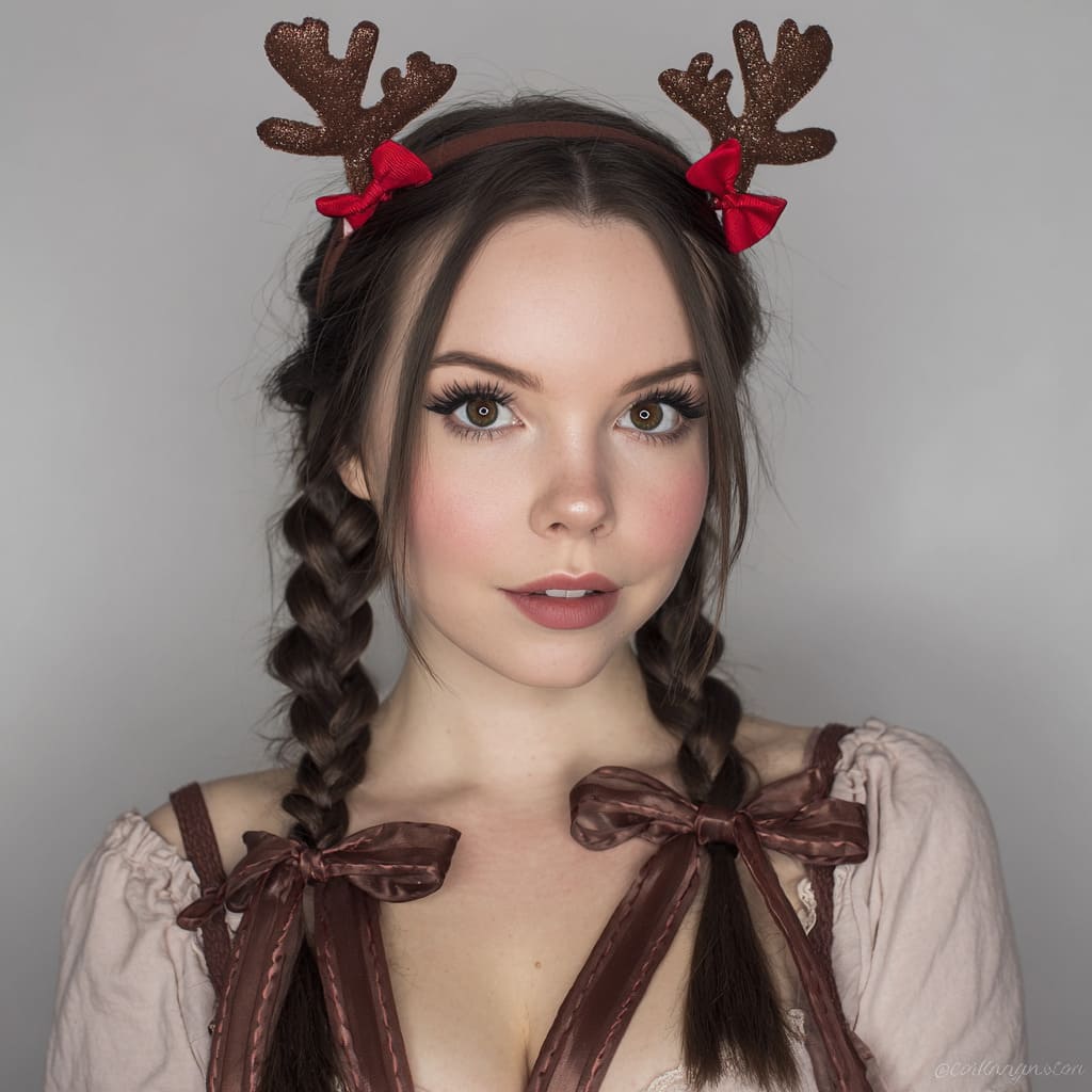 Two braided pigtails styled with brown ribbons and antler headbands make a playful reindeer look. Add a little red bow in the middle for a “Rudolph” nod. Cute, fun, and Instagram-ready.