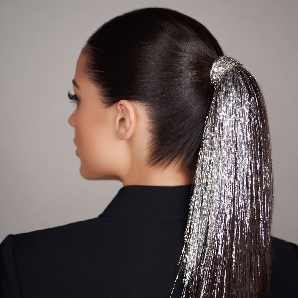 A sleek ponytail decorated with silver tinsel strands looks festive and chic. It adds instant sparkle without much effort. Perfect for both work parties and family gatherings.