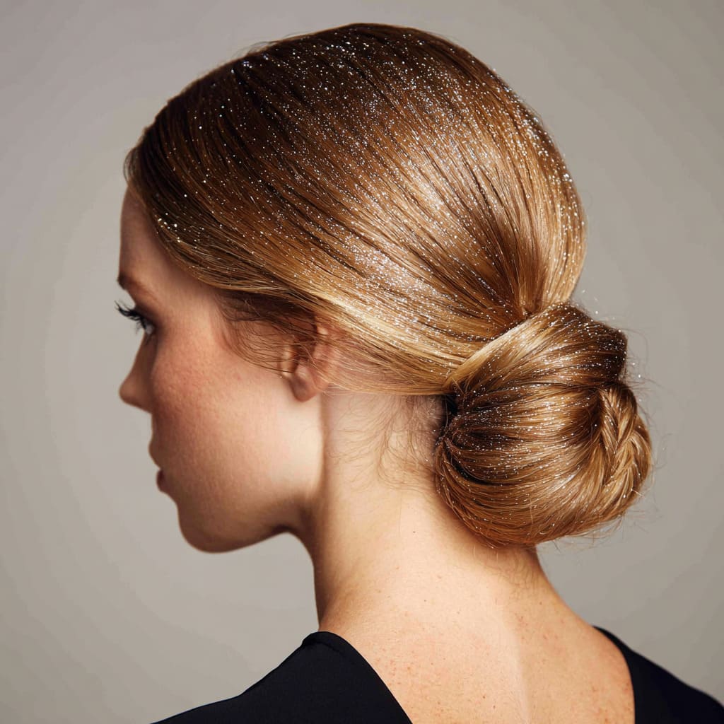 A polished chignon looks extra festive when dusted with glitter hairspray. It’s sophisticated but still playful. A great choice for Christmas dinners.