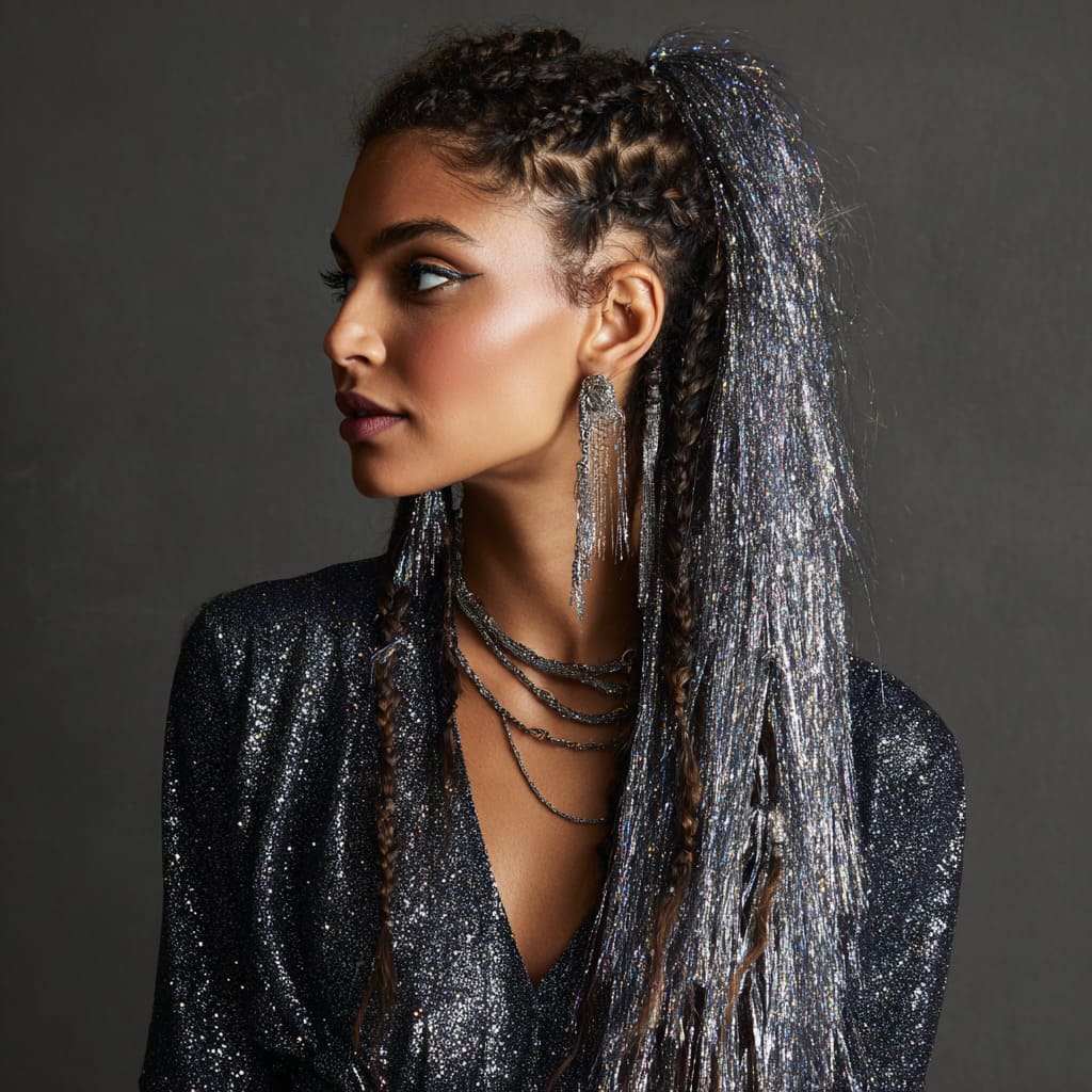 Add strands of hair-safe tinsel to your braids or twists for a sparkly effect. The metallic shimmer moves with your hair and catches every bit of light. Perfect for parties where you want to glitter all night.
