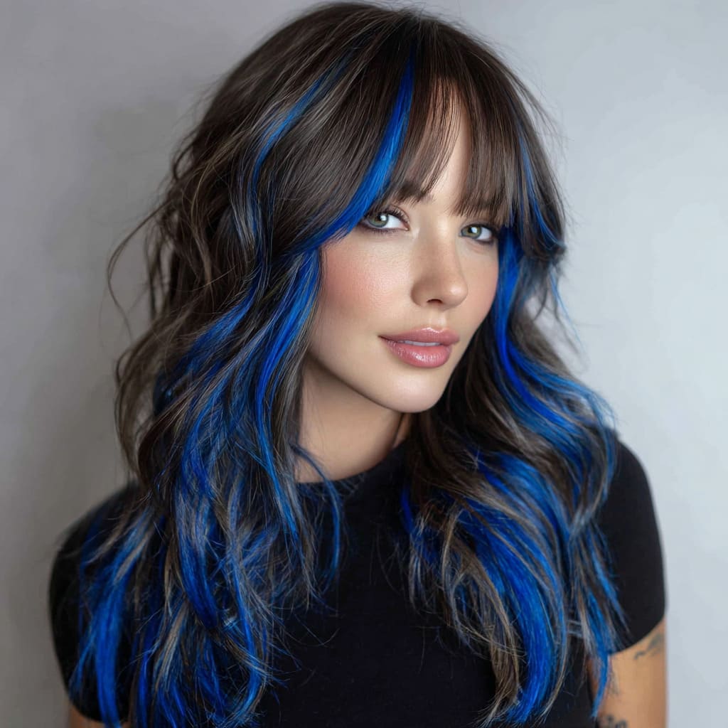 Bright blue chunky highlights are edgy and fun. They work beautifully in both straight and wavy hair. Bold, creative, and unapologetically unique. Perfect if you want to stand out in a crowd.