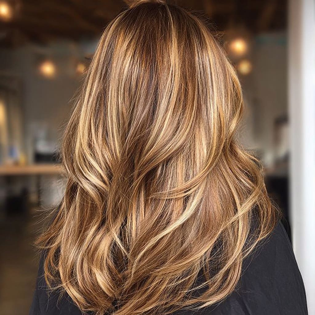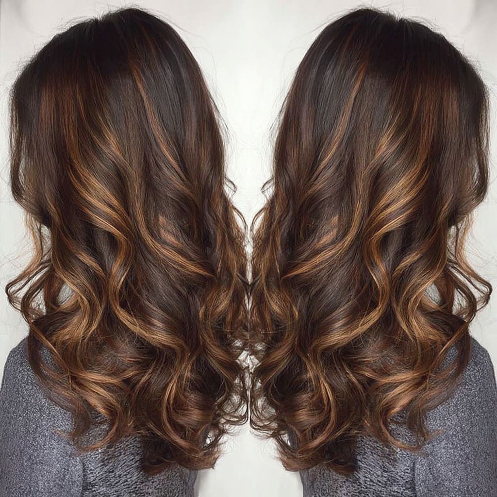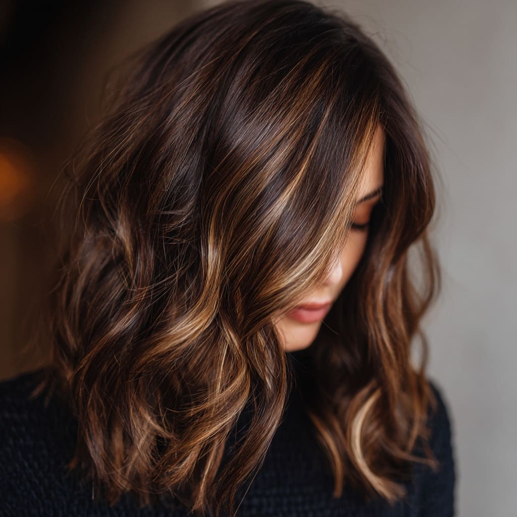 Dark brown hair looks stunning with caramel chunky highlights. The contrast adds warmth and dimension without feeling overdone. It’s a cozy yet stylish look for fall and winter. Great for brunettes who want a change that still feels natural.