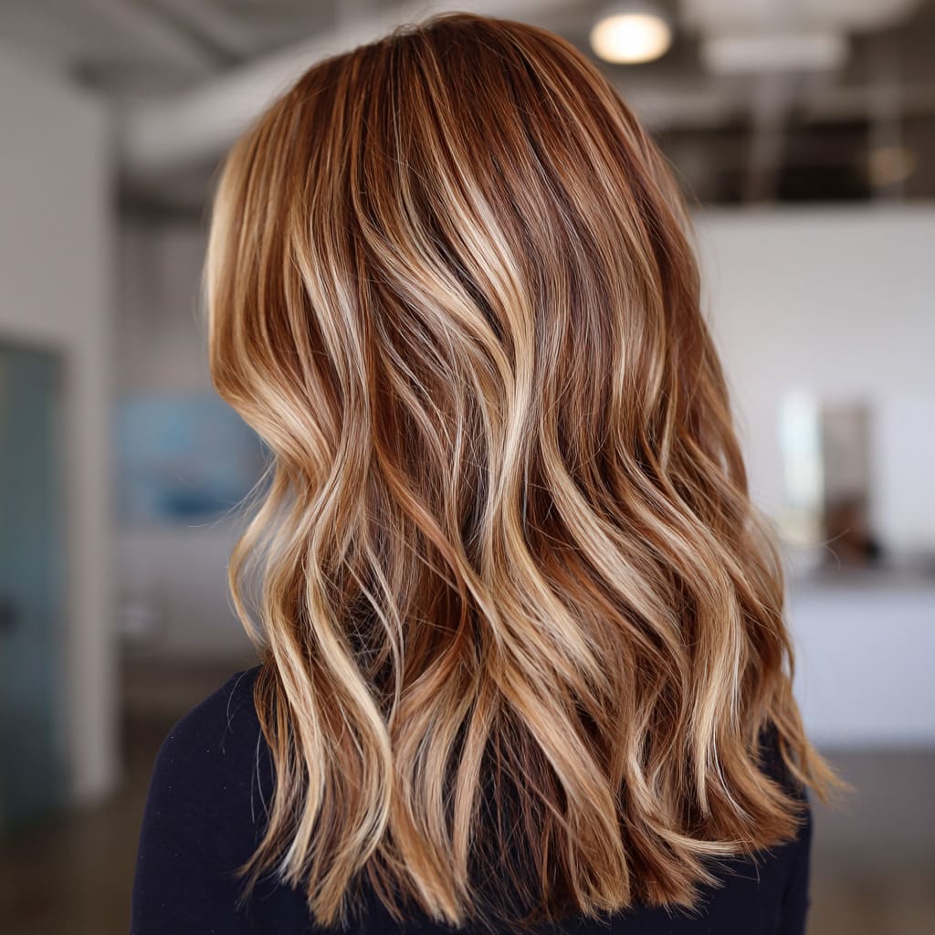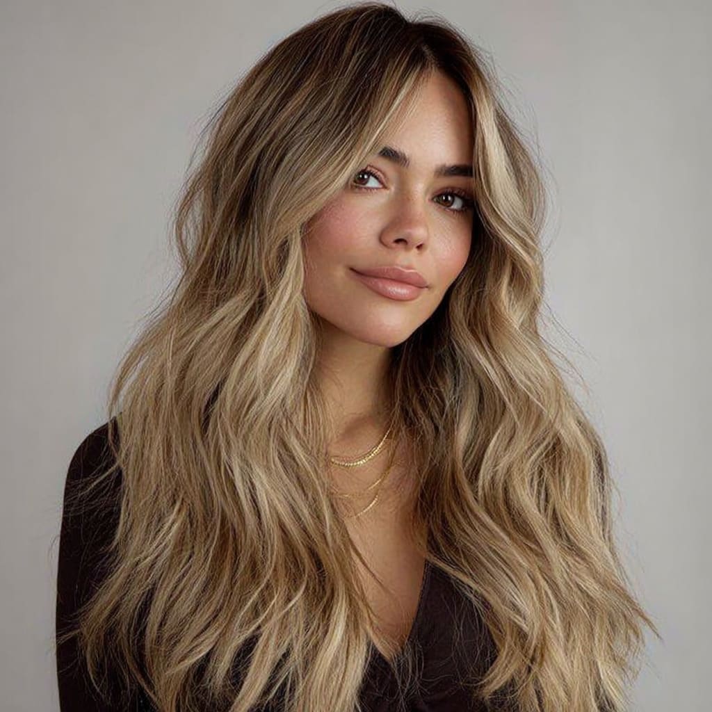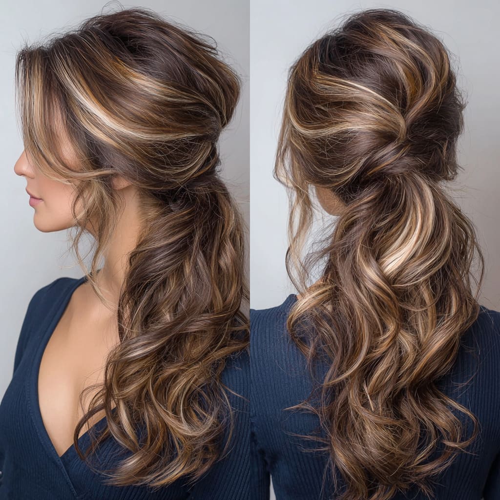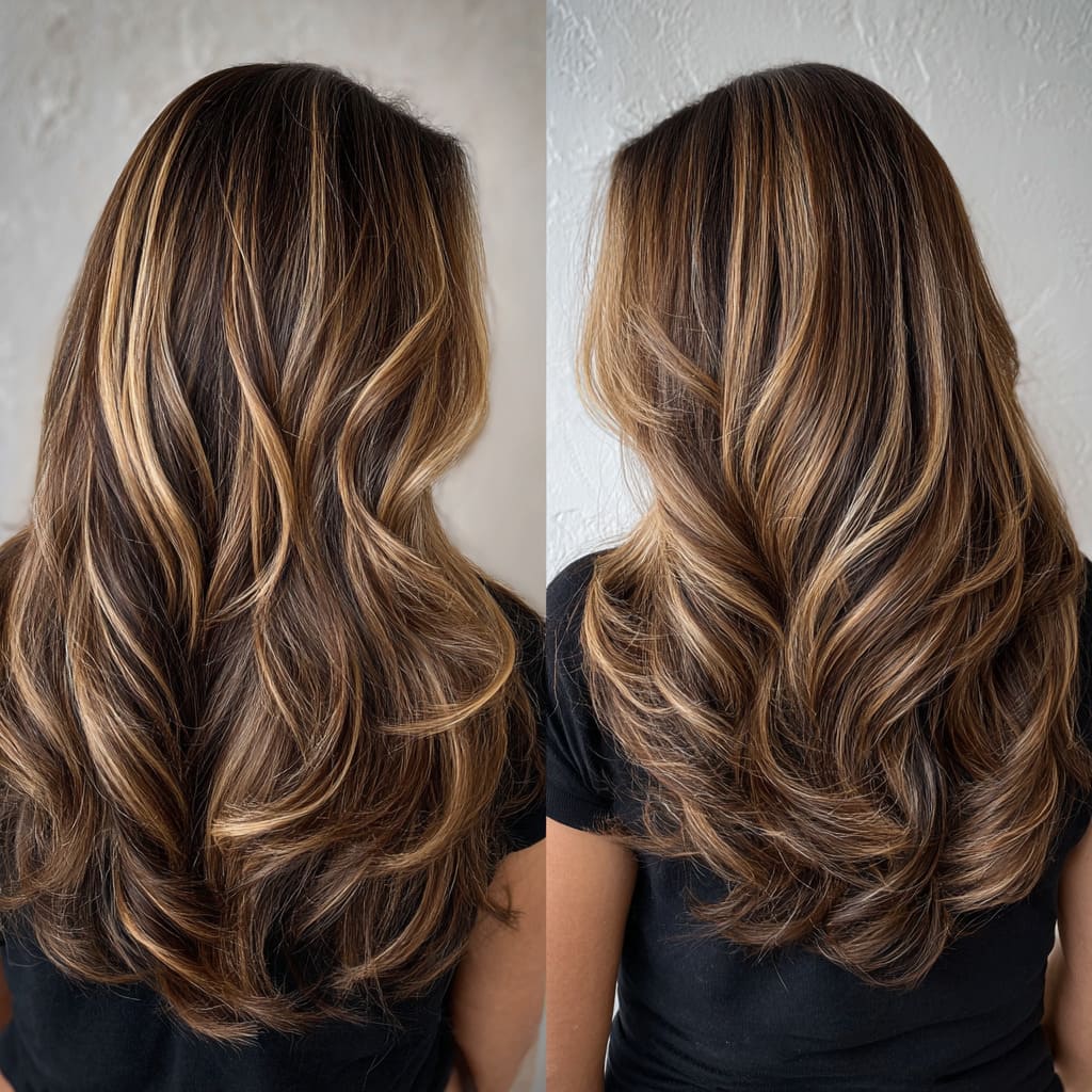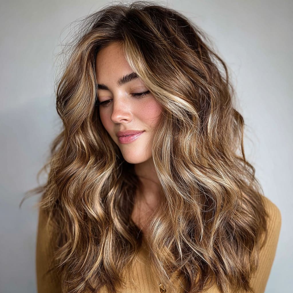 Chunky highlights paired with loose waves create a gorgeous beachy vibe. The lighter streaks catch the light with every movement. It’s casual, pretty, and perfect for laid-back styles. A great choice for anyone who loves effortless glam.