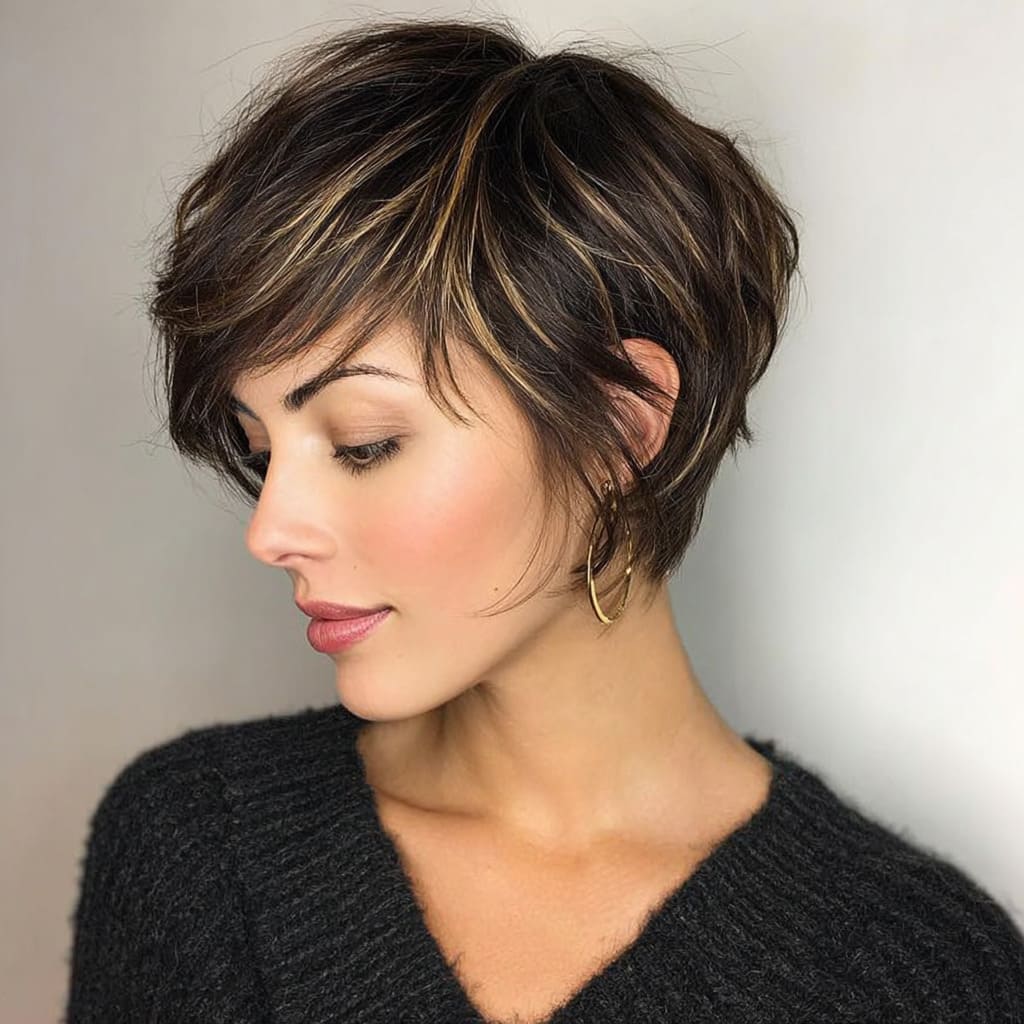 Short haircuts like bobs look even trendier with chunky highlights. The color blocks add movement and depth to the sleek cut. This style feels chic, edgy, and fashion-forward. It’s a modern twist on a classic haircut.