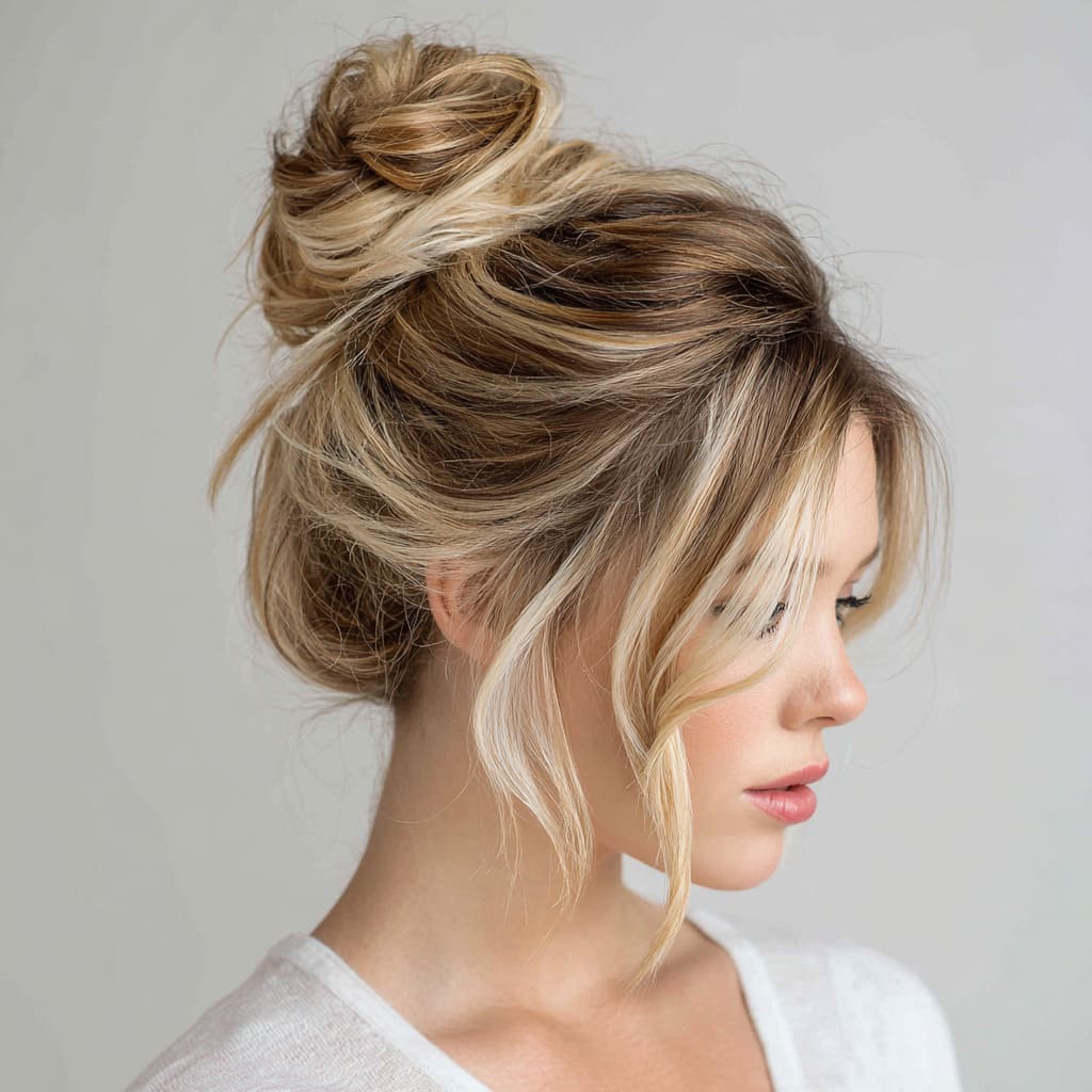Top knots look extra stylish when chunky highlights peek through. The streaks give the bun depth and dimension. It’s casual yet chic, great for parties or everyday wear. The easiest way to make a simple updo look trendy.