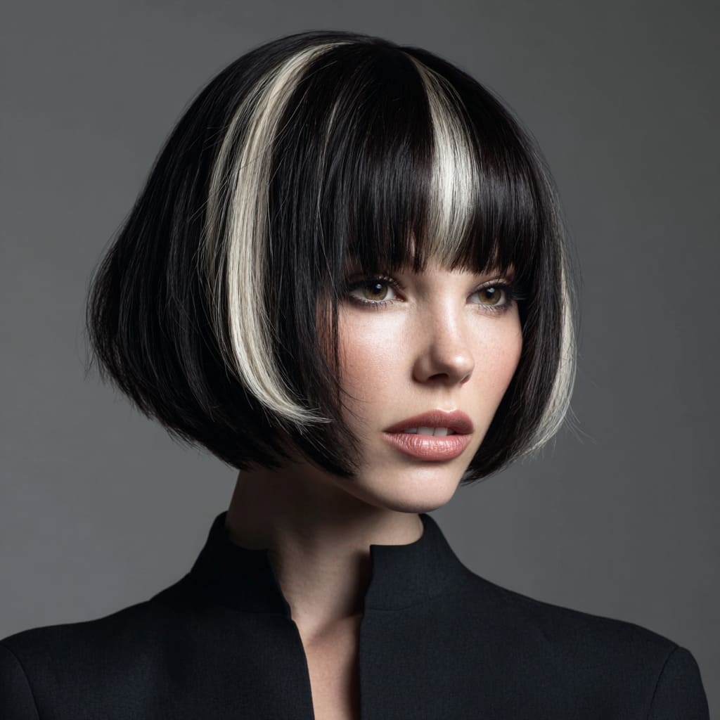 A sharp bob in dark hair with platinum chunky highlights looks ultra-modern. The contrast is bold and geometric. It feels edgy and fashion-week ready. A show-stopping choice for anyone who loves sleek styles.