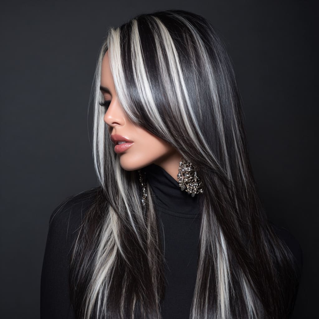 Nothing screams bold like platinum chunky highlights against jet-black hair. The high contrast feels edgy and dramatic. It’s a statement-making look perfect for anyone who loves standing out. Pair it with sleek straight styles for maximum impact.