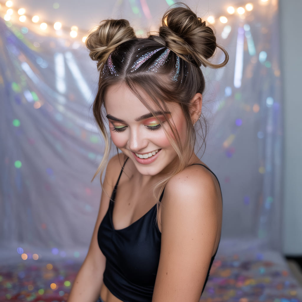Twist each side of your hair into buns on top of your head, leaving a few strands loose for softness. Add glitter to the part line for extra sparkle. It’s quirky, bold, and perfect if you want to stand out.