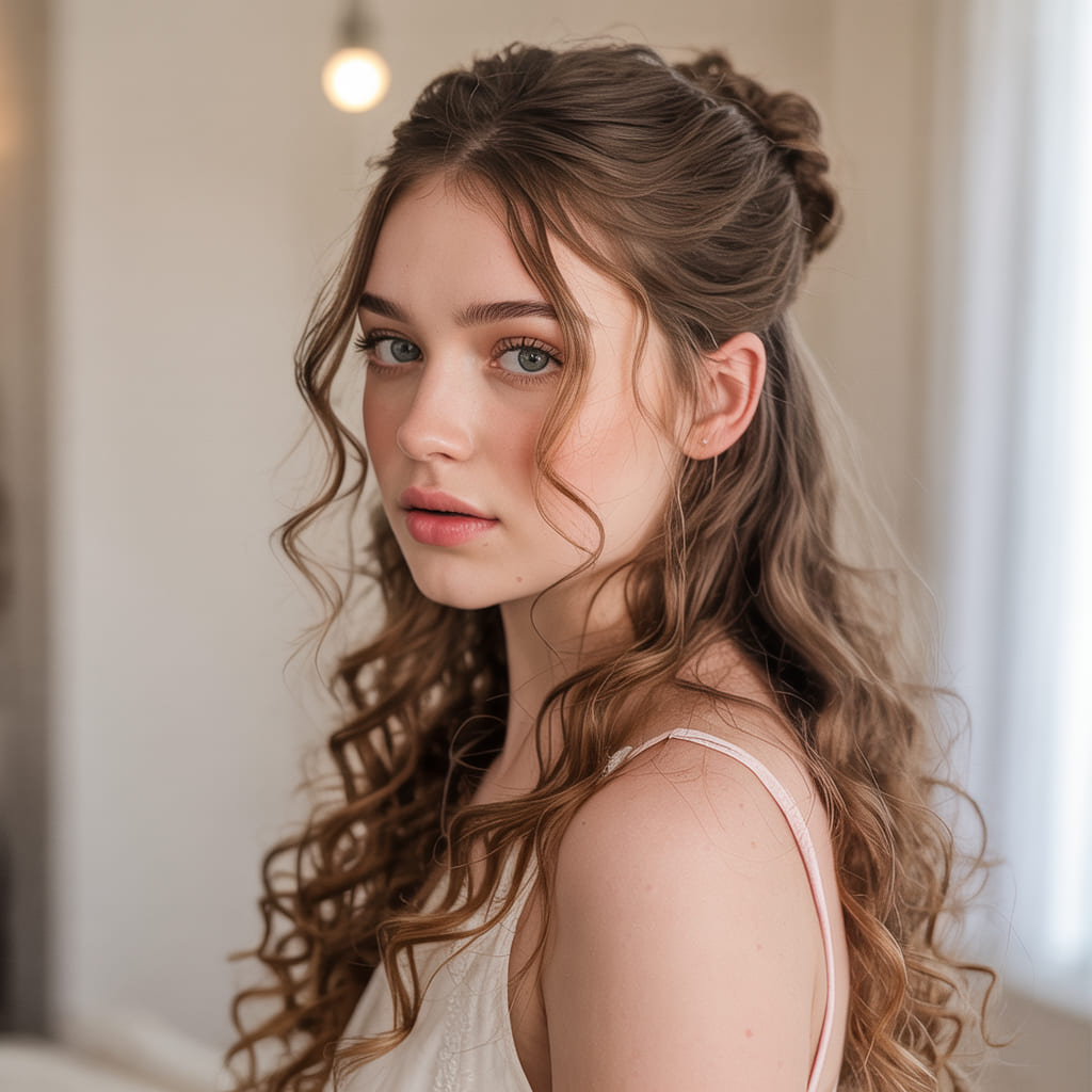 By tying just the top half into a bun, you keep hair away from your face while letting the rest flow freely. Loose curls on the bottom half make the style feel soft and romantic. It’s one of those hairstyles that looks chic without trying too hard. Bonus: it holds up well on the dance floor.