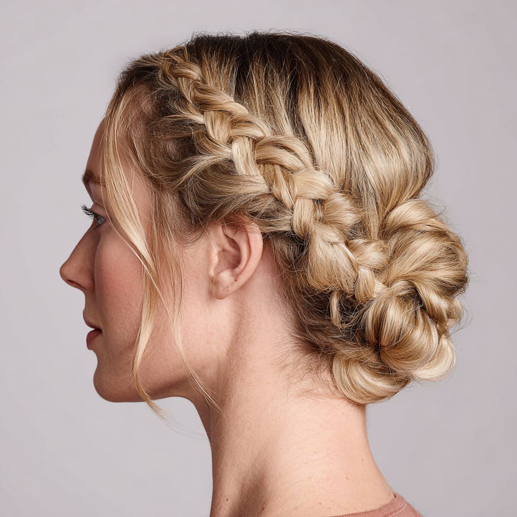 Double Dutch braids leading into a low bun is a fun and creative take on the classic braided look. The braids add texture and volume, while the bun at the back gives you a neat and polished finish. This style works great for oval faces as the braids help balance proportions. It’s great for an athletic or active look that still feels elegant.