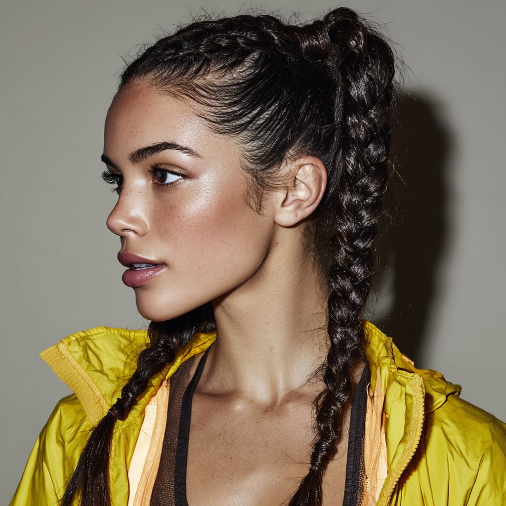 For something trendy, try a high ponytail with two braids on the sides. The braids add interest to the sleek ponytail and draw attention to your face. It’s a sporty yet chic style that gives an extra pop while keeping things fun. Perfect for a gym-to-cafe day or a weekend outing.