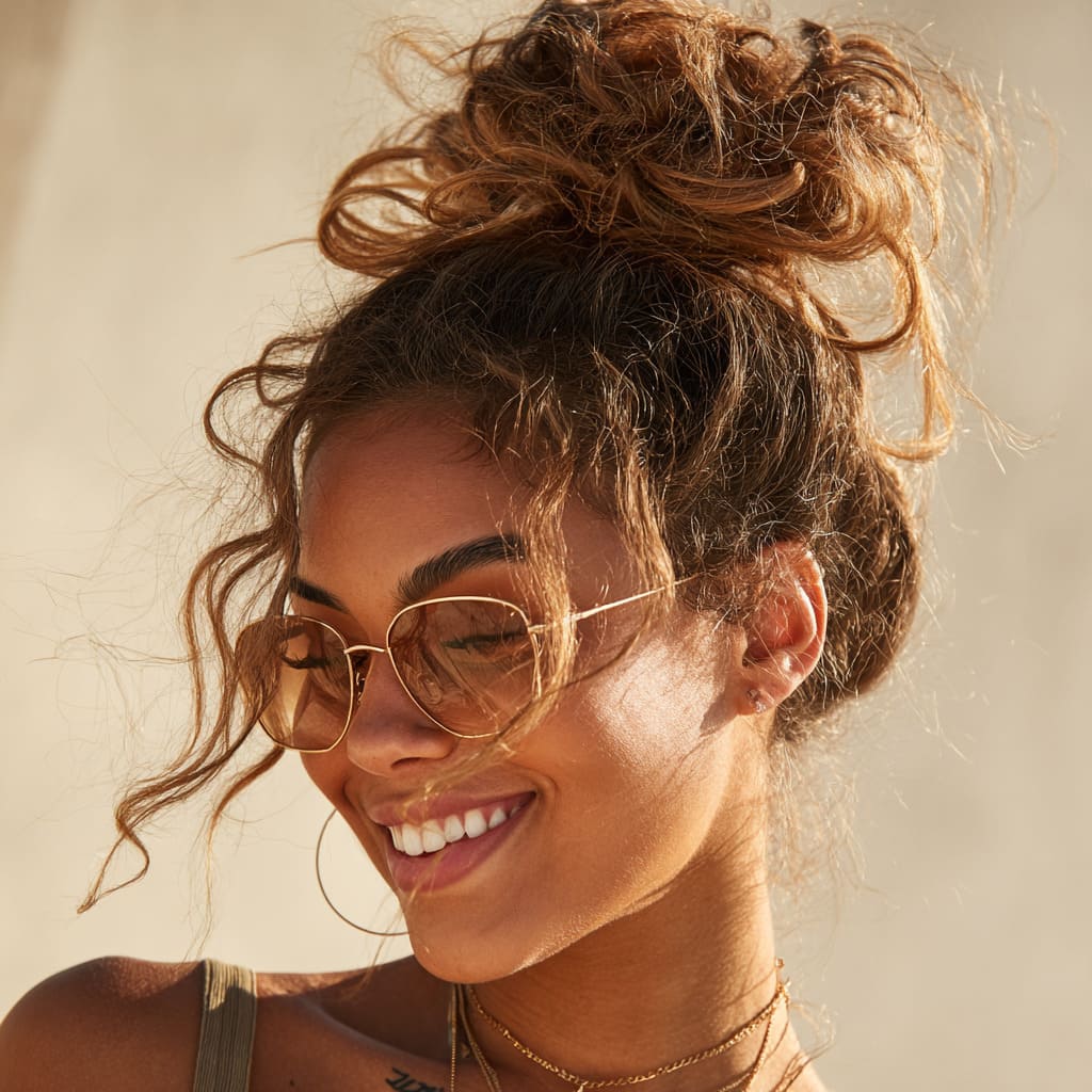 7. Messy Top Knot with Face-Framing Strands
