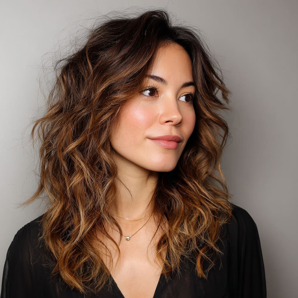 Embrace the effortless vibe of soft, messy waves with a side part. The uneven texture gives your hair movement and volume, creating a relaxed yet chic look. This style is perfect for oval faces because the waves create an illusion of width while balancing the facial structure. It’s casual, carefree, and perfect for everyday wear.