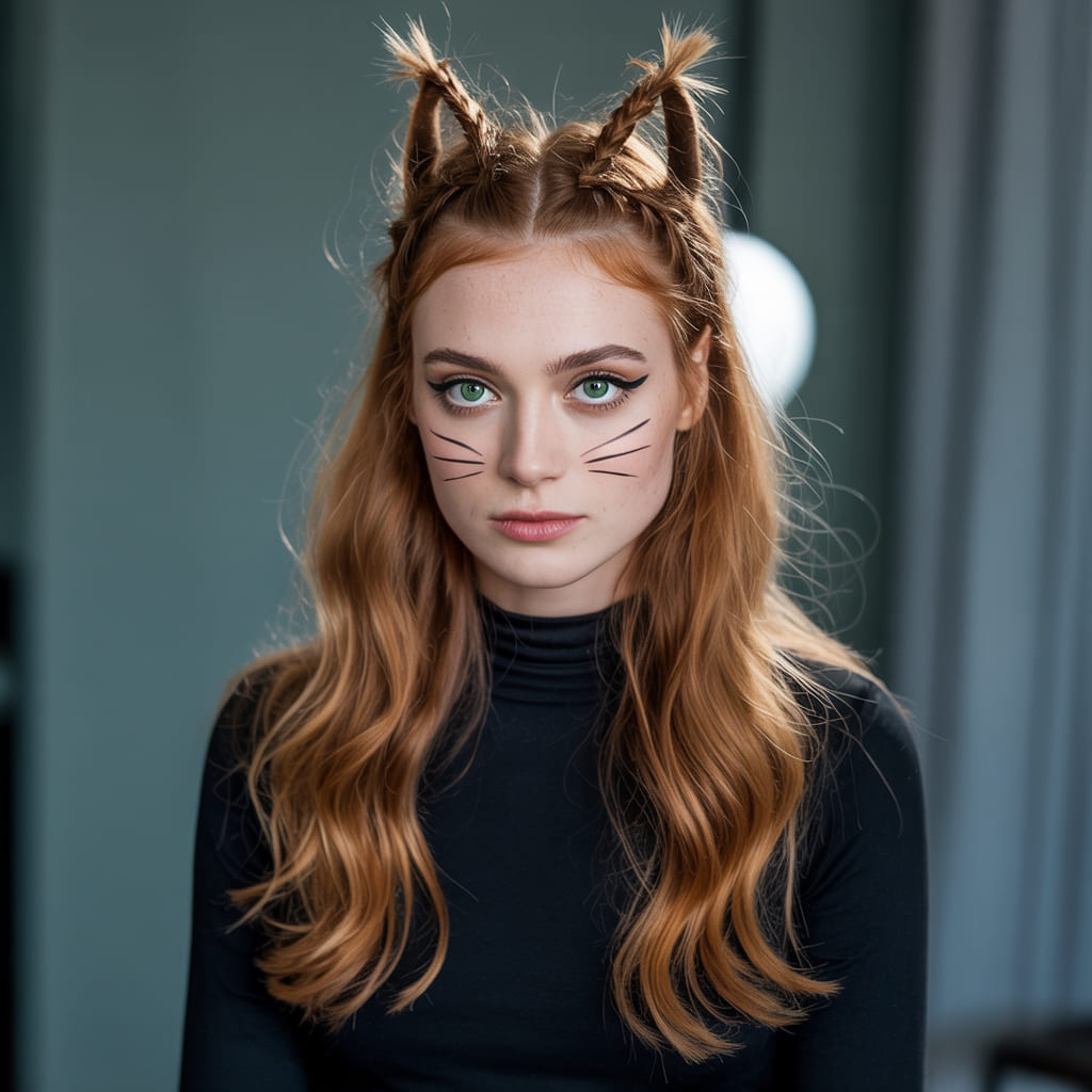 Add whiskers and eyeliner for the complete look. This hairstyle is playful and quick, making it perfect for last-minute parties. It’s a Halloween classic that never fails.