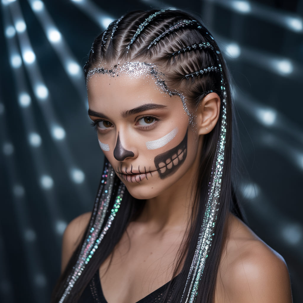 Pair it with skeleton face paint, and the effect is striking under party lights. It’s creative, dramatic, and surprisingly easy to pull off. Just be ready to leave a little sparkle everywhere you go.