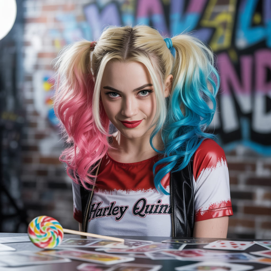 The messier, the better. It captures her chaotic energy perfectly. Add her signature makeup, and you’ll look like you came straight out of a comic book. It’s bold, playful, and always a crowd favorite.