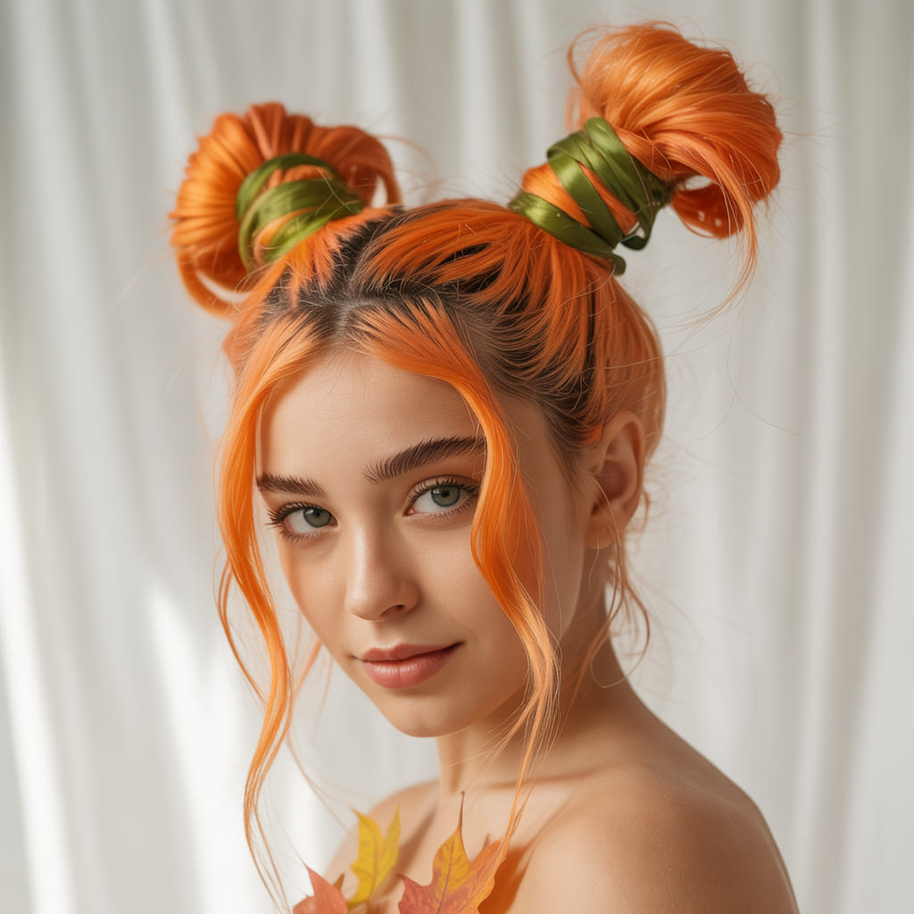 Nothing screams “fall fun” like pumpkin spice buns. Style your hair into two high space buns and spray them orange with temporary color. Wrap the bases with green ribbons to mimic pumpkin stems for an adorable touch.