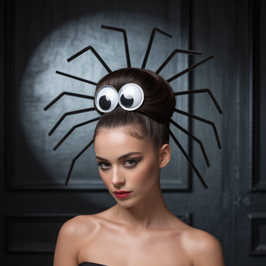 Cute but creepy, the spider bun is one of the most creative Halloween hairstyles. Twist your hair into a bun and stick black pipe cleaners out to mimic legs. Add googly eyes to the bun itself for the full spider effect.