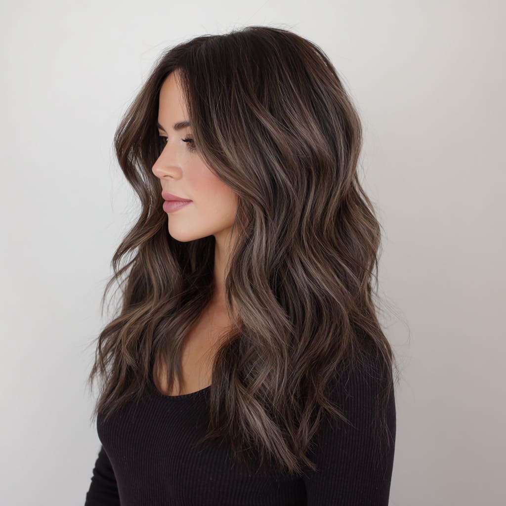Ash brown highlights add a cool, smoky edge to your brunette base. The contrast feels modern and sophisticated, especially if you prefer a muted, low-maintenance look. Balayage placement keeps the tone natural and seamless as it grows out. It’s an effortlessly elegant update for every brunette.