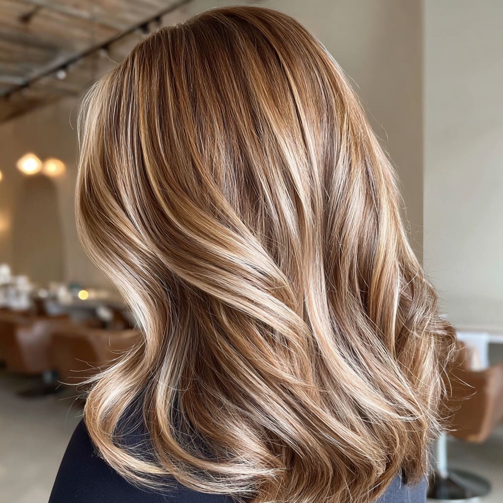 Sweet, creamy toffee tones blend beautifully into medium brown hair. The result is a smooth, caramel-like finish that’s soft but statement-making. These warm highlights make your hair look thicker and more dimensional. It’s the ultimate cozy-meets-chic look.