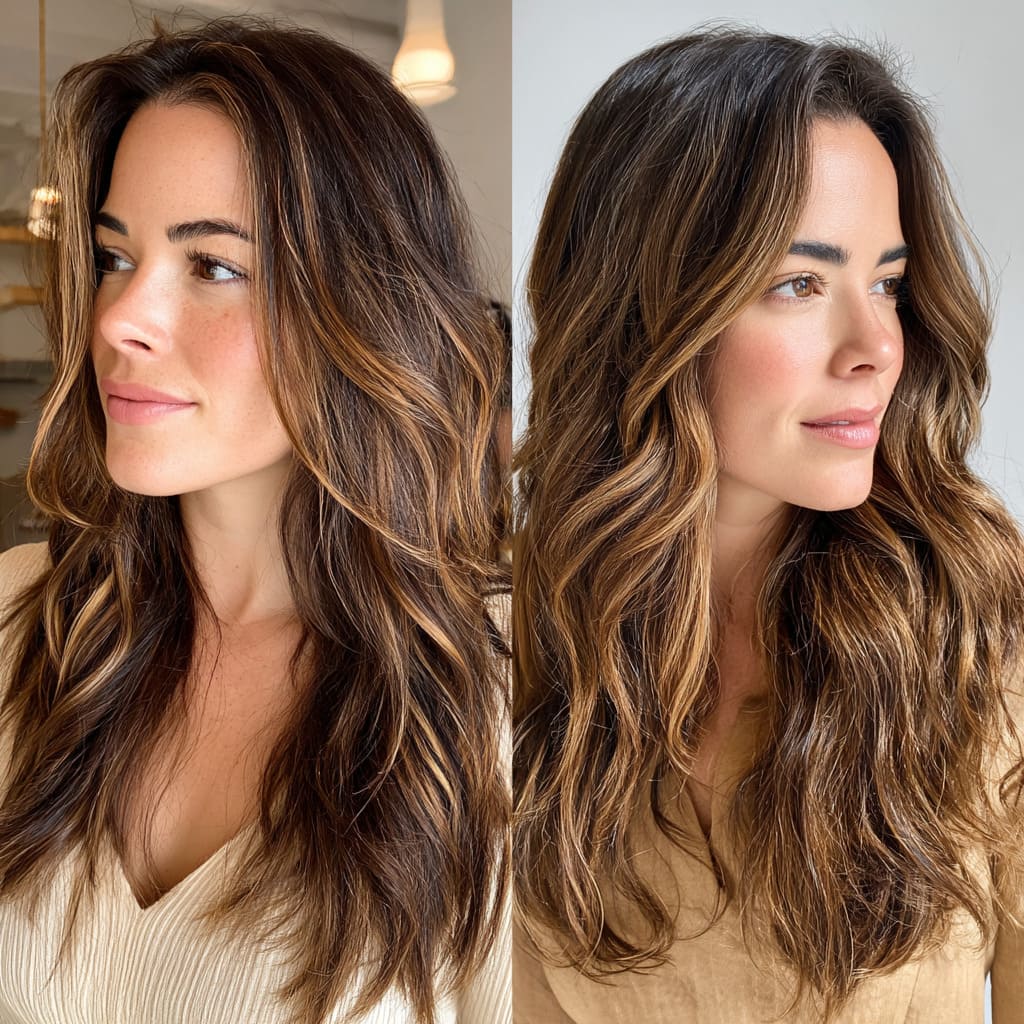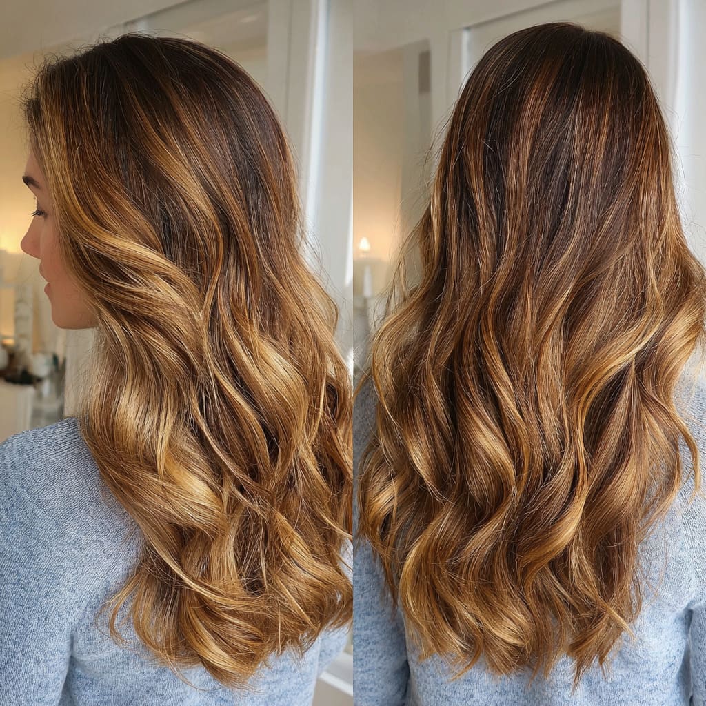 Golden melt highlights transition beautifully from dark roots to glowing ends. The blend creates a silky, fluid look that feels ultra-luxurious. It’s especially gorgeous on layered cuts or long waves. This style makes your hair look like it’s kissed by sunlight all year long.