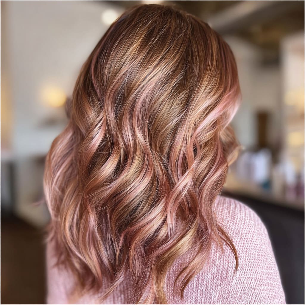 Rose gold highlights on brown hair bring a touch of fun and femininity. The pink-golden shimmer adds warmth and uniqueness to your overall look. It’s perfect for trend-lovers who still want something wearable. Soft, radiant, and totally Instagram-worthy — this shade turns heads every time.
