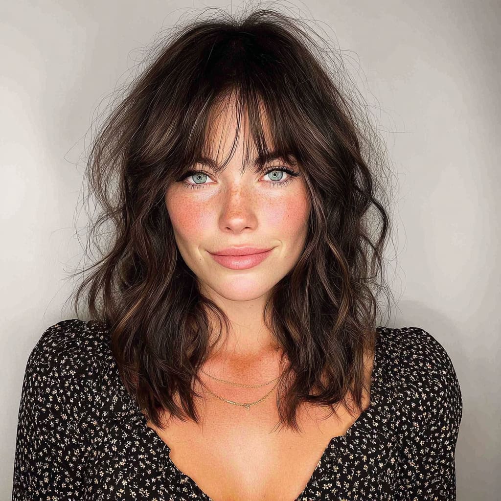 10. Wavy Mid-Length Cut with Bangs