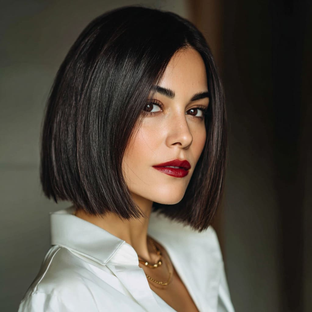 A sharp, blunt bob is timeless and exudes confidence. This hairstyle adds structure to your face, making it perfect for those who love bold, clean lines. It’s a great option for brunettes with thick or straight hair, offering a chic, polished look every time.