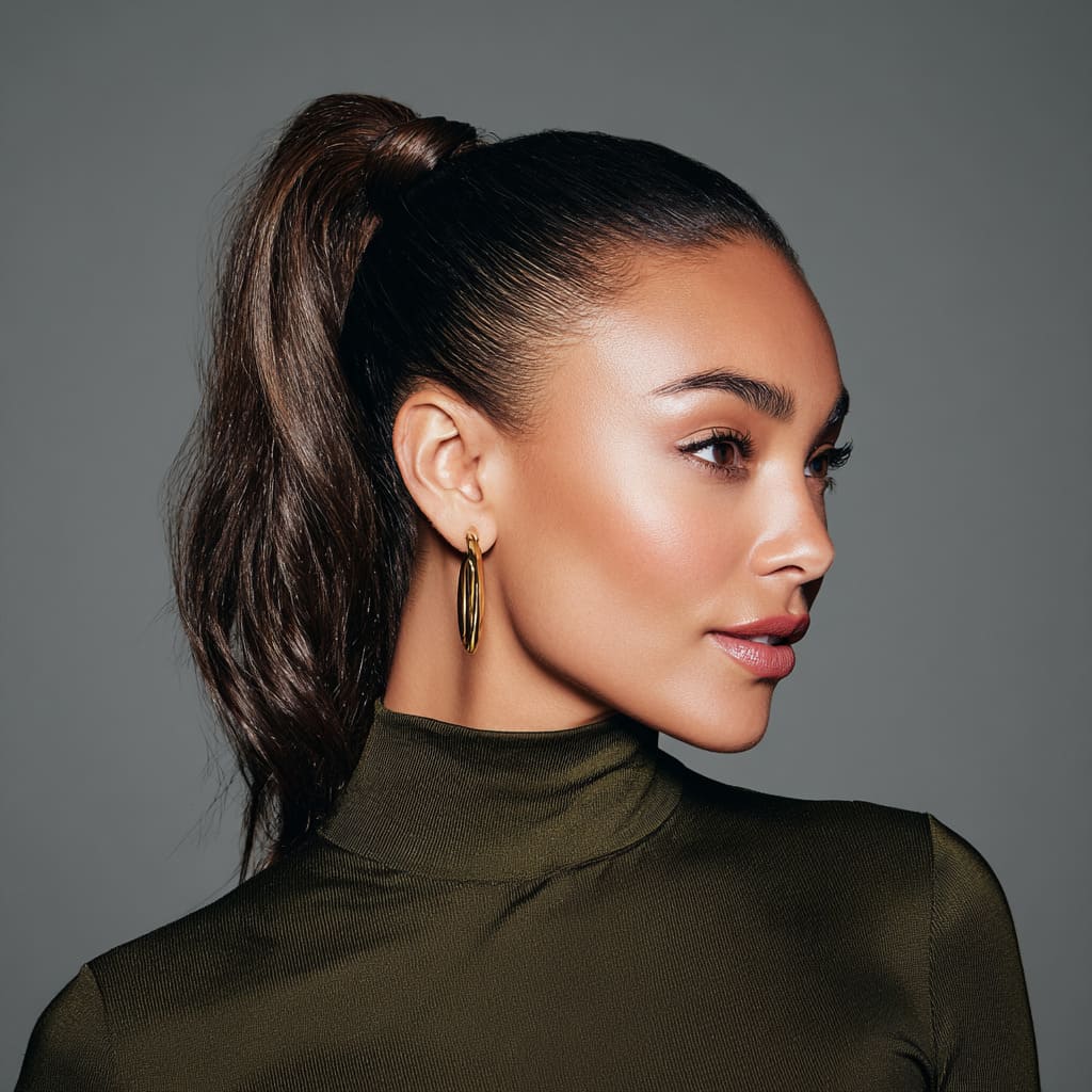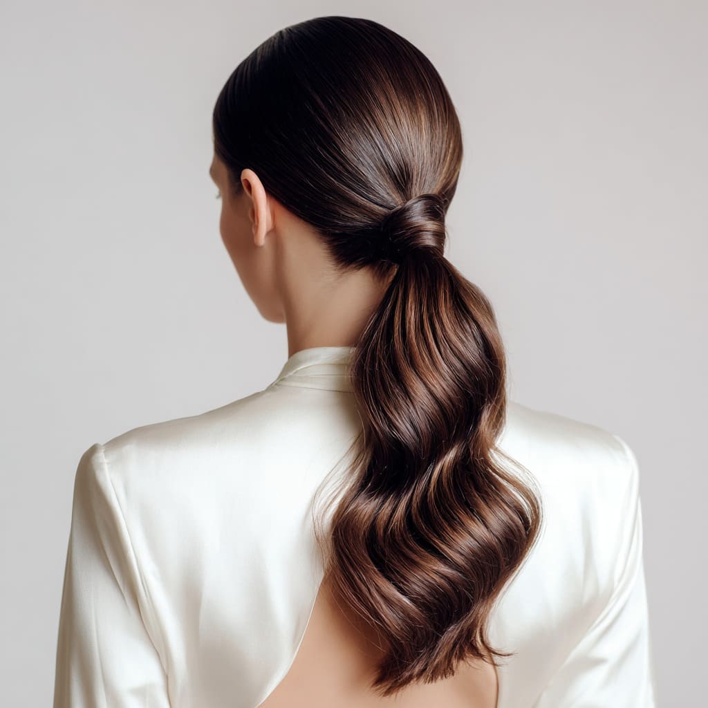A low ponytail styled with a sleek finish and a few gentle waves at the end feels incredibly refined. The elegance lies in its simplicity: secure the ponytail low and wrap it with a small strand of hair for added polish. This style feels luxurious and effortless.