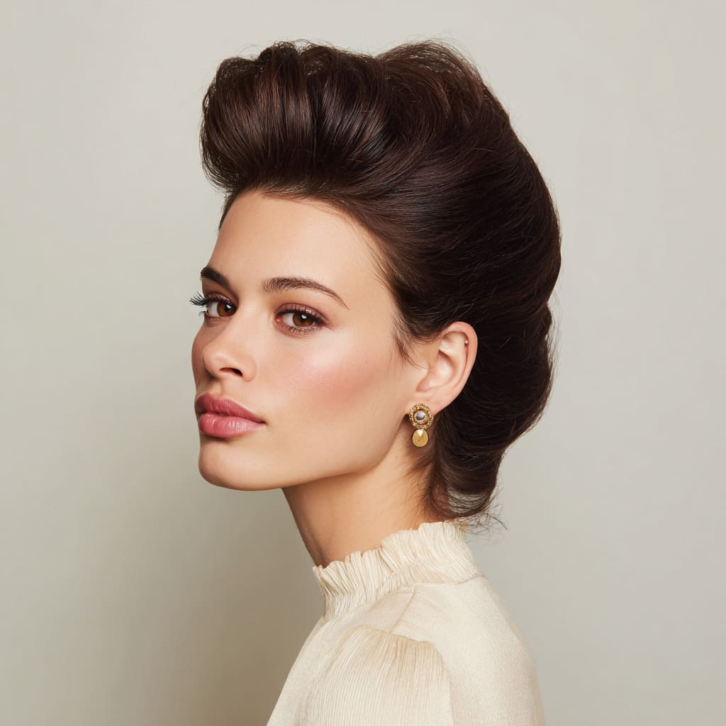 Channel vintage vibes with a sculpted pompadour on brunette hair. This high-volume style adds instant sophistication and drama, perfect for making a statement. It’s refined yet playful, giving you the perfect balance of elegance and edge.