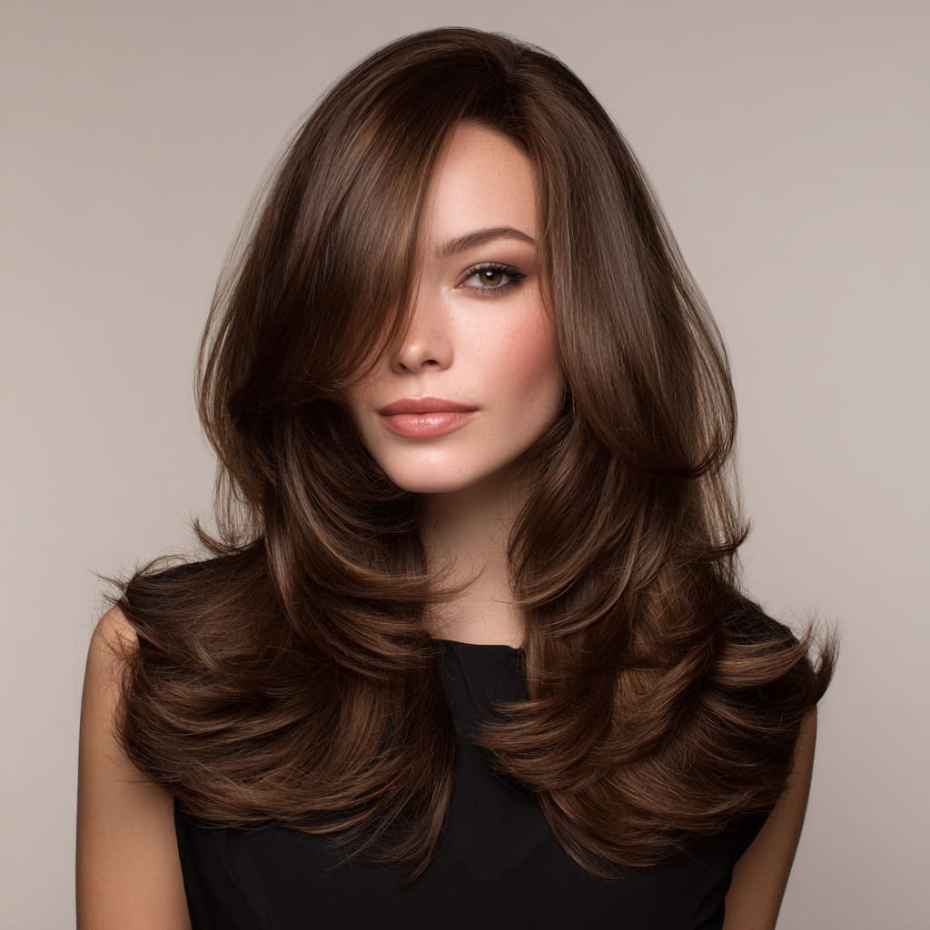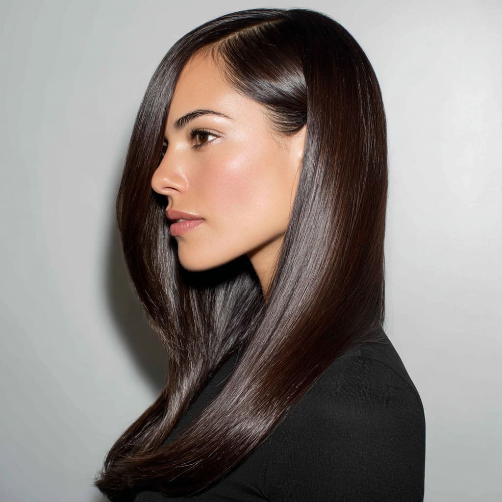A sleek, straight look with a deep side part creates a chic, sharp silhouette. This style is polished, showing off the natural shine of your brunette hair. It’s perfect for creating a refined look that’s still easy to maintain, especially for long-haired brunettes.