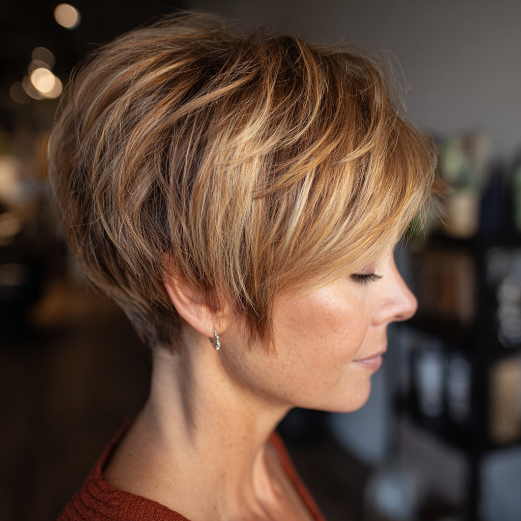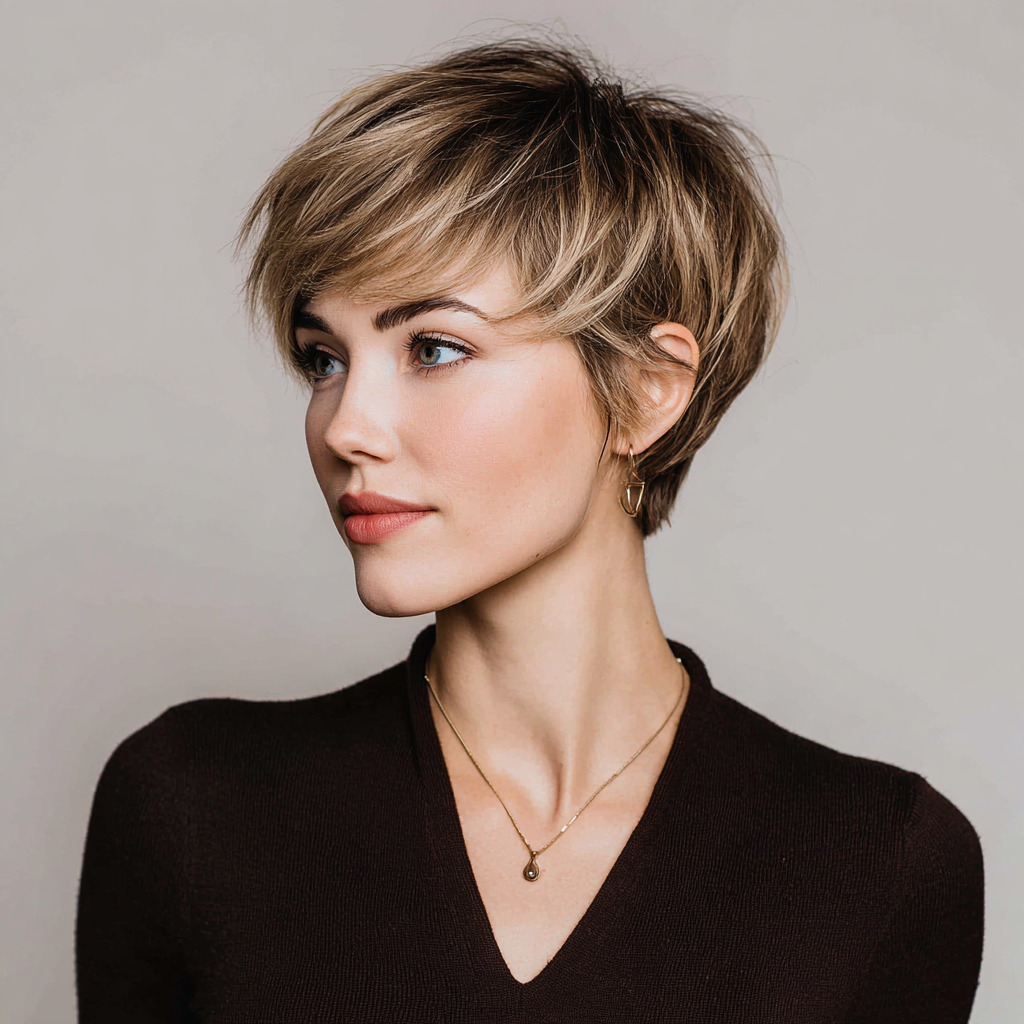 For those who prefer a little length, this cut gives you the best of both worlds. The longer layers soften your look while keeping the easy maintenance of a pixie. You can tuck the sides behind your ears or curl them slightly for movement. It’s simple, pretty, and feminine.