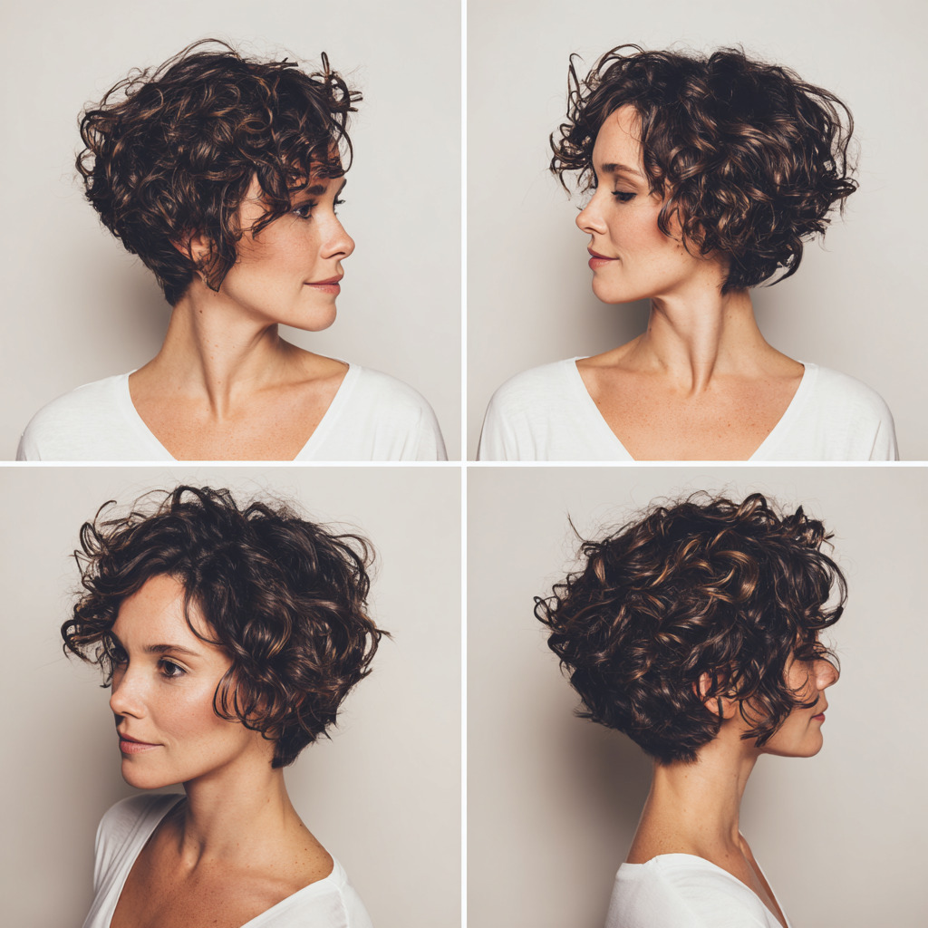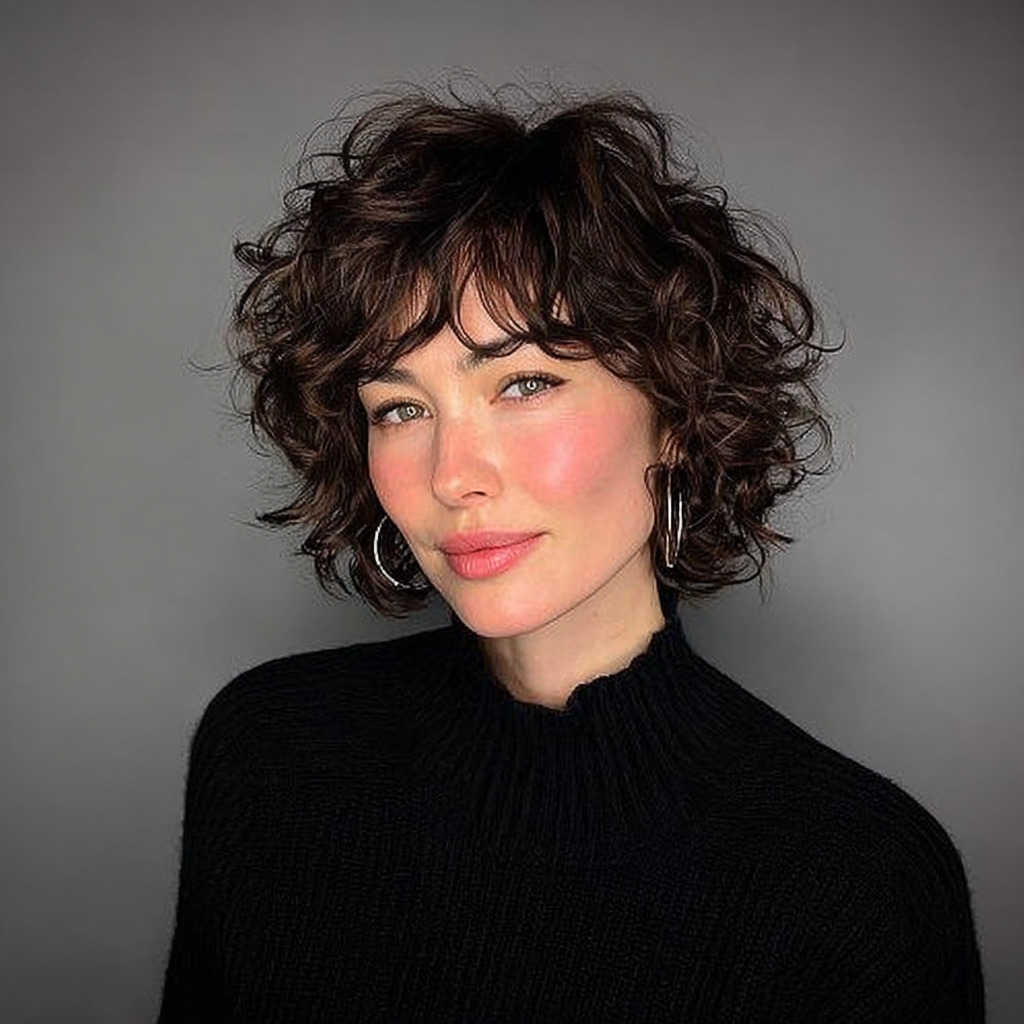 Soft curls and short layers combine to create a bouncy, romantic hairstyle. The shape keeps your curls defined while preventing too much bulk. It’s ideal for women who want volume without heaviness. A bit of curl cream will make your texture shine naturally.