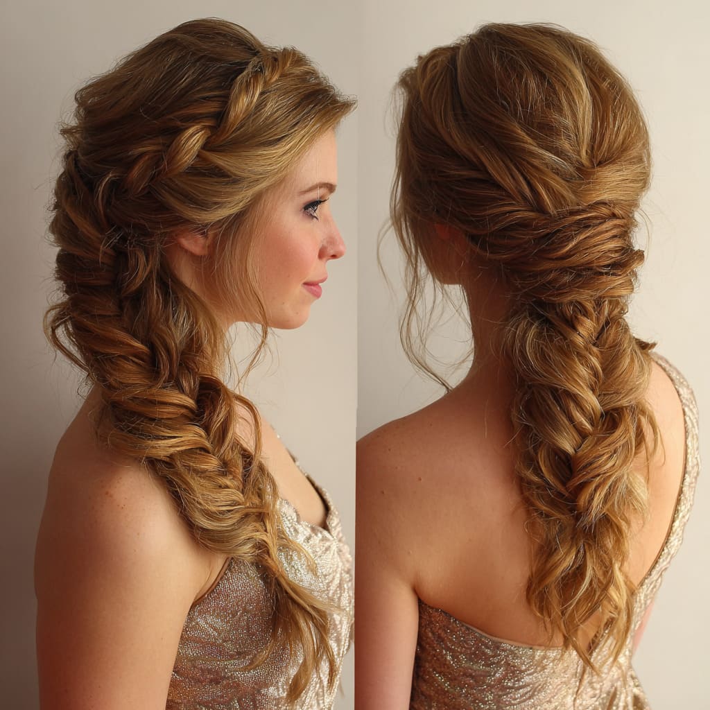 The fishtail braid is intricate yet fun, making it a standout prom hairstyle. It works with both straight and wavy textures and looks amazing draped over one shoulder. Add some glitter hairspray for a playful twist. It’s detailed, unique, and perfect if you want to stand out.